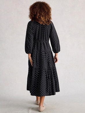Laid-back elegance, reinterpreted. Constructed from recycled polyester, this dress is tiered with a slight gather in each panel.