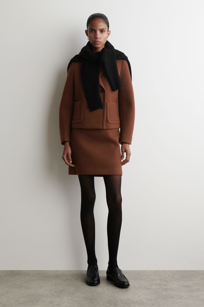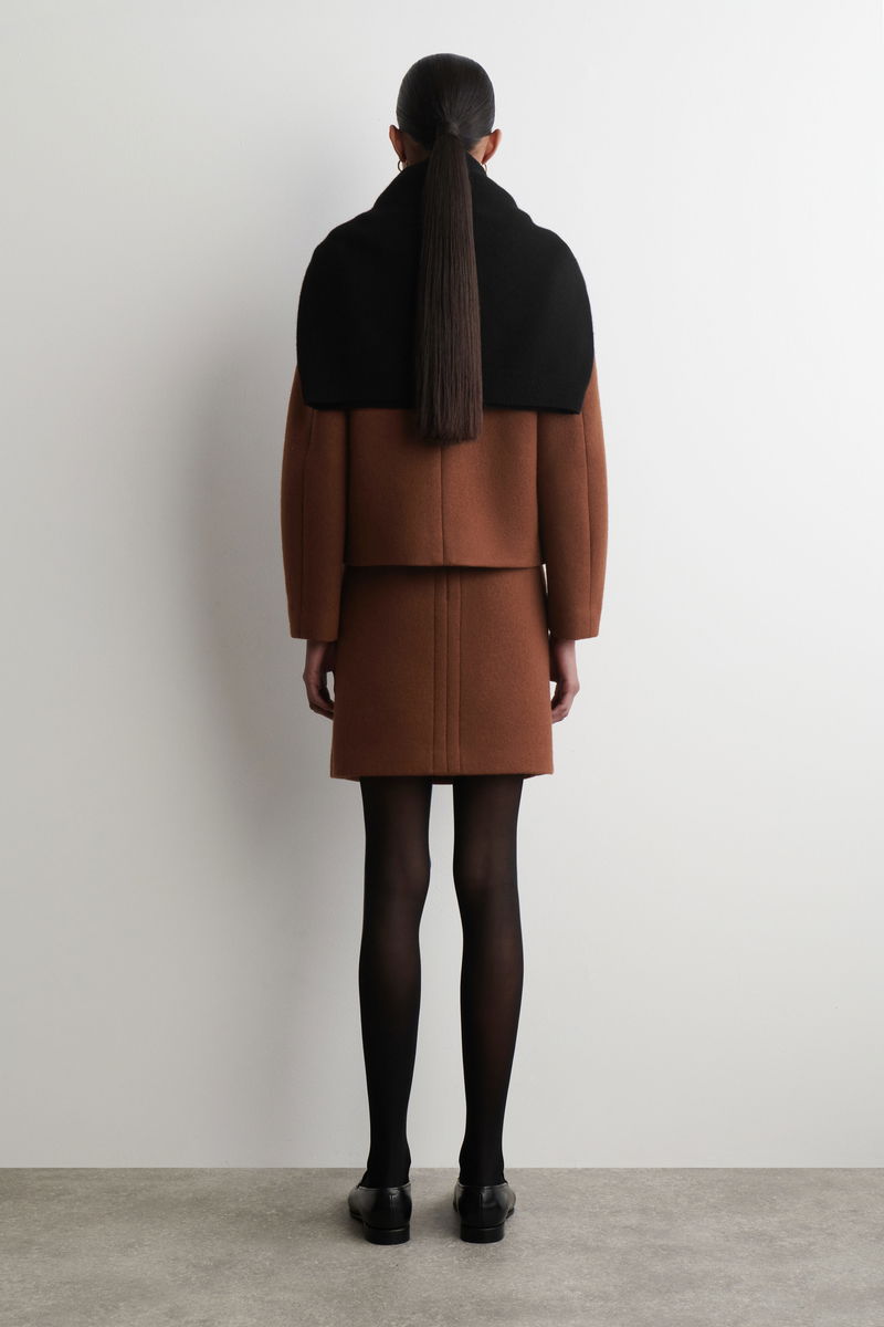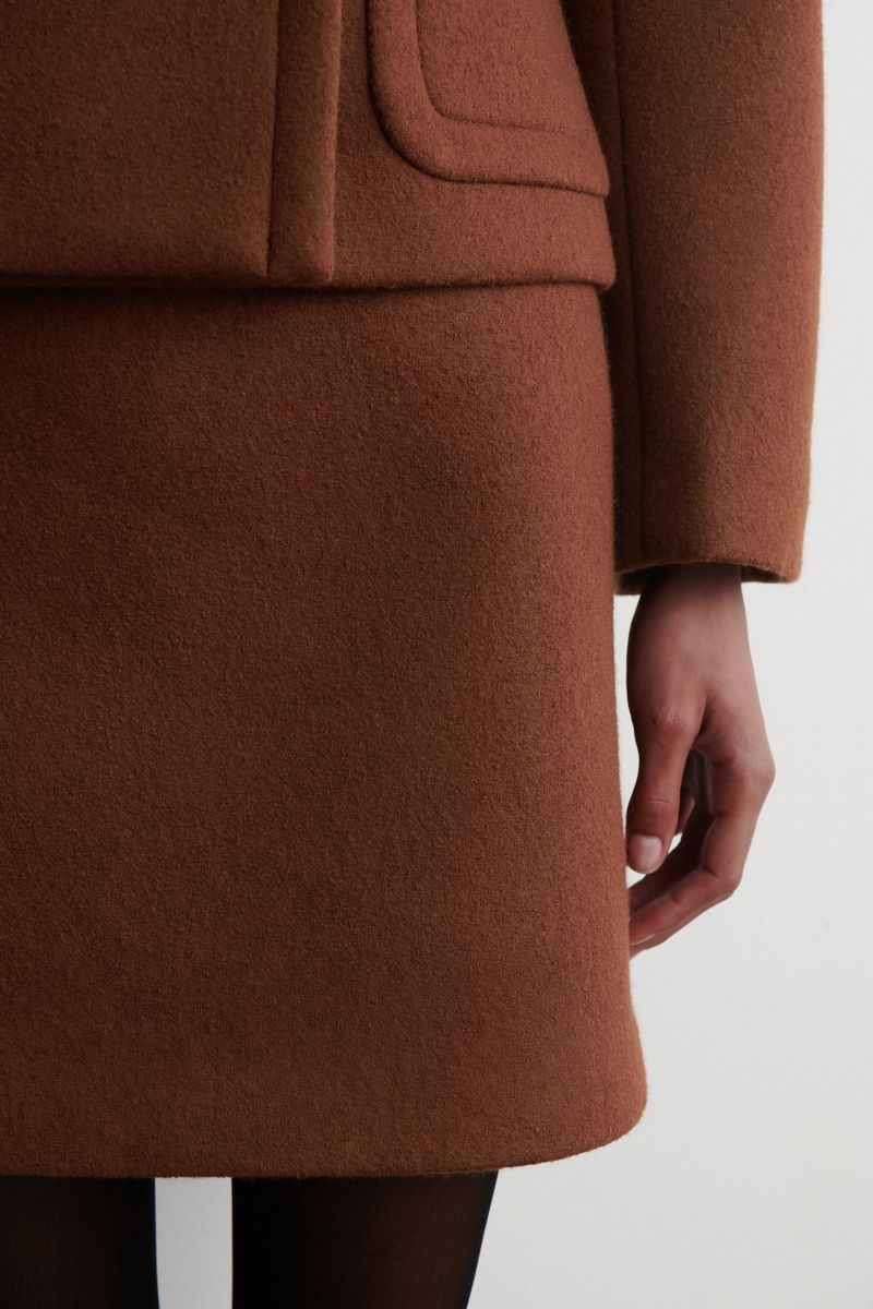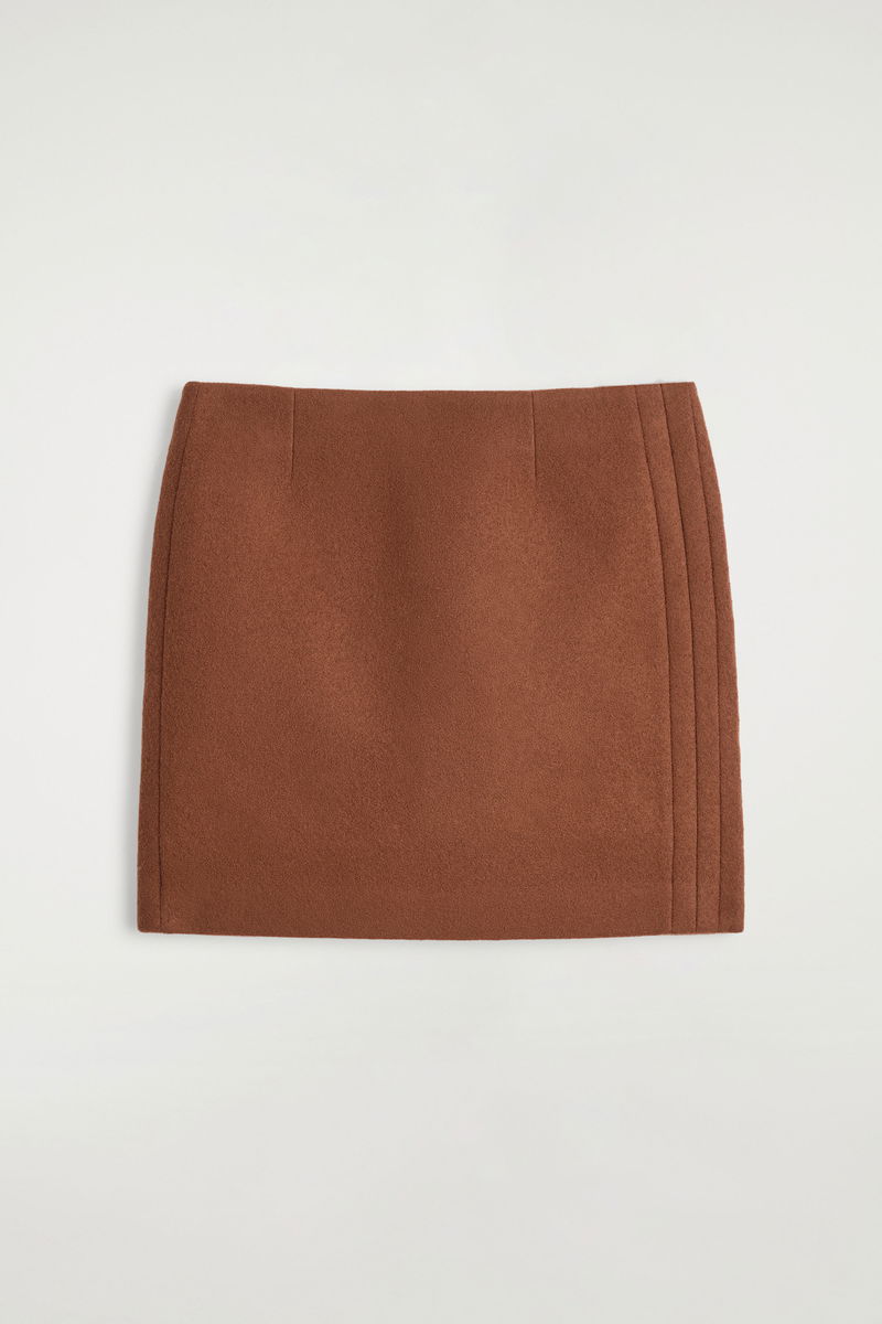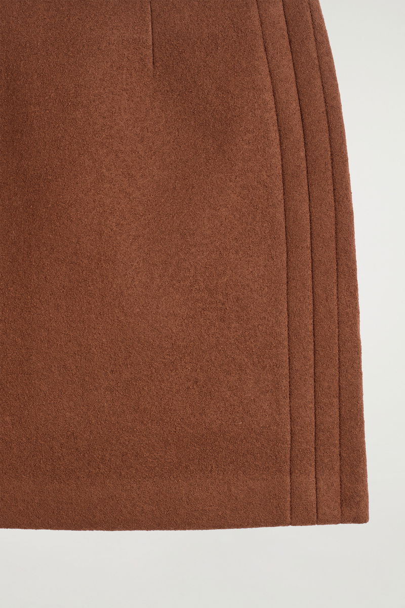 Borrowing from '80s silhouettes, this A-line mini skirt is crafted from bonded wool with topstitching that frames one side. It's rendered in a rich chocolate tone that pairs back with the matching blazer for a tailored look.