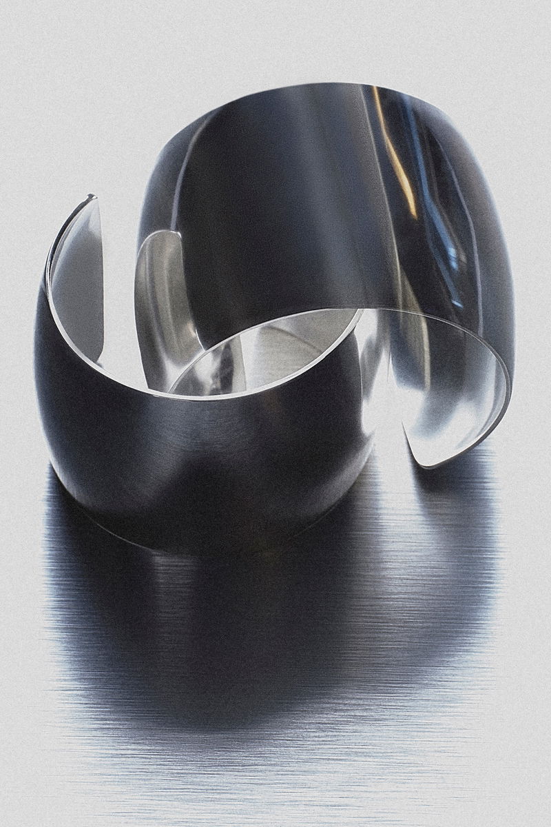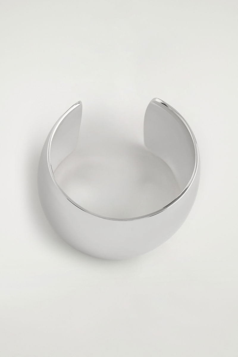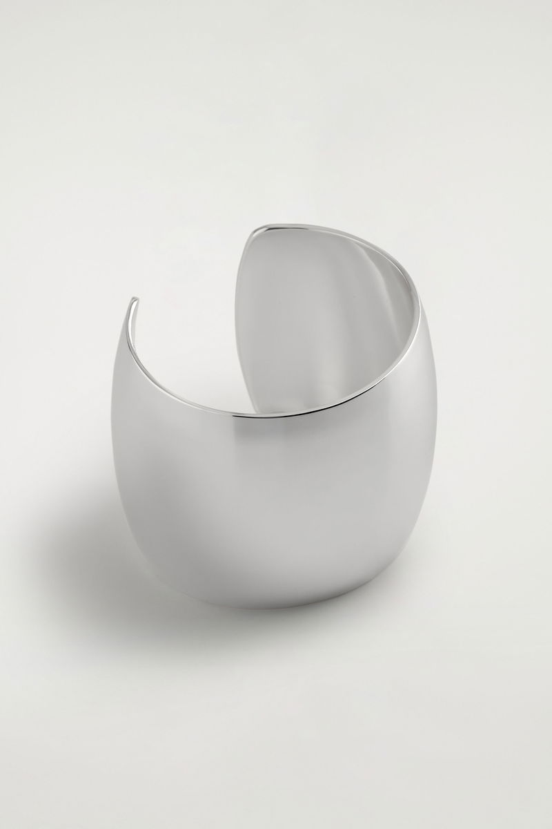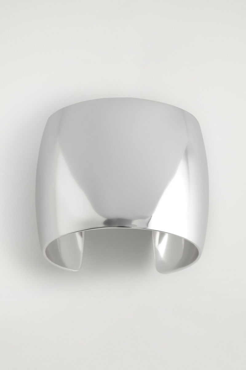 This refined cuff is simple yet impactful. It's crafted from recycled brass that's plated with silver for a polished shine and designed in a wide, curved shape that wraps around the wrist. Style it with mixed metals for a modern take on layering.