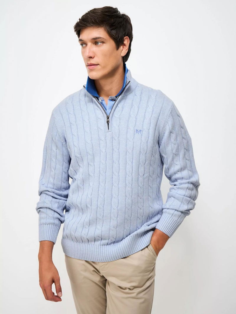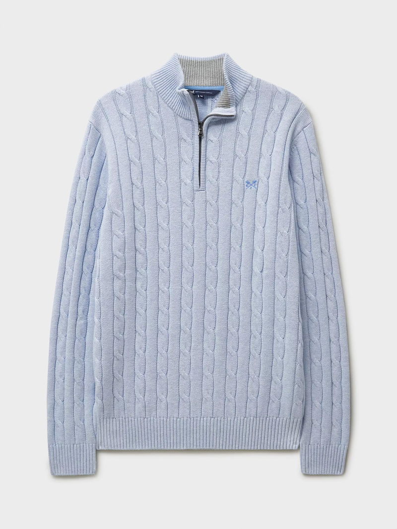 Cotton Half-Zip Cable Knit Jumper, Light Blue