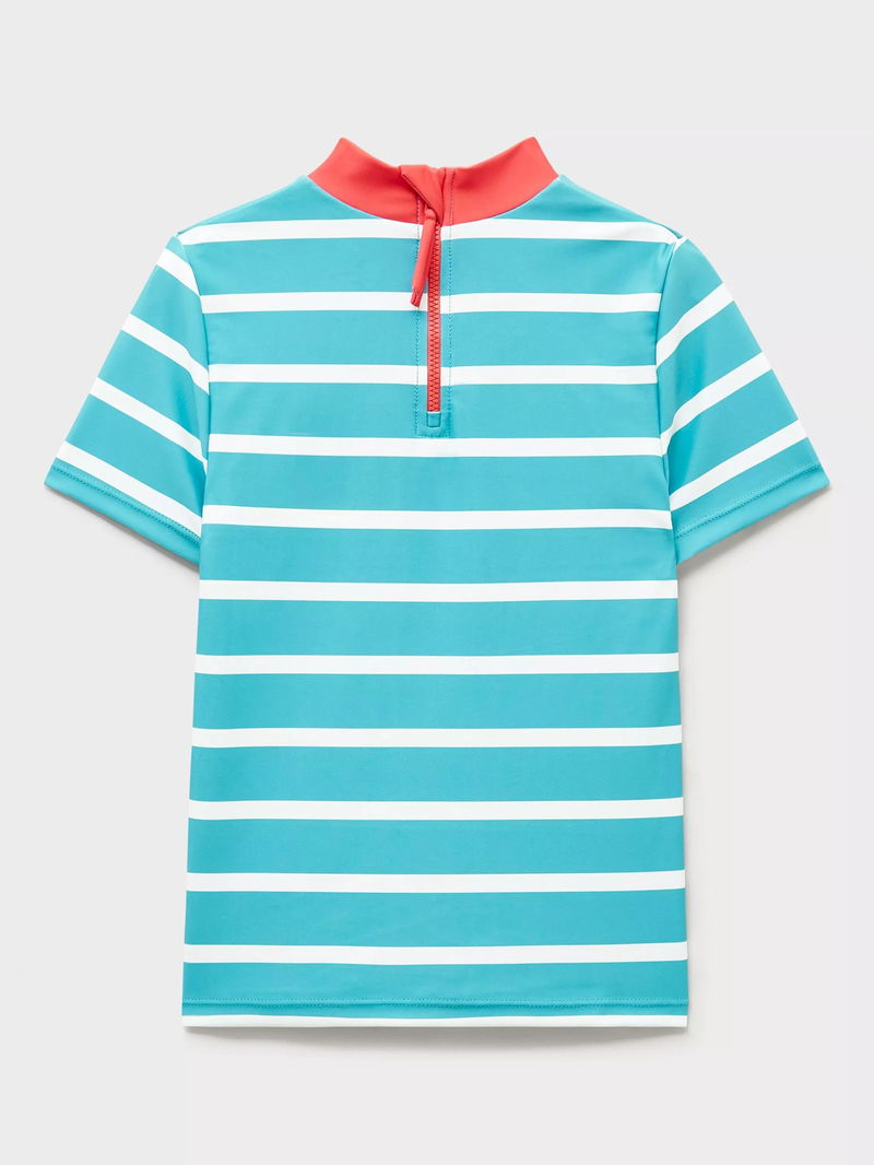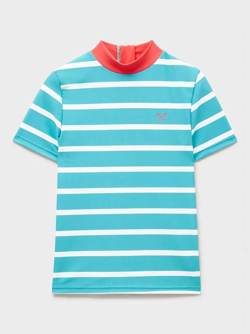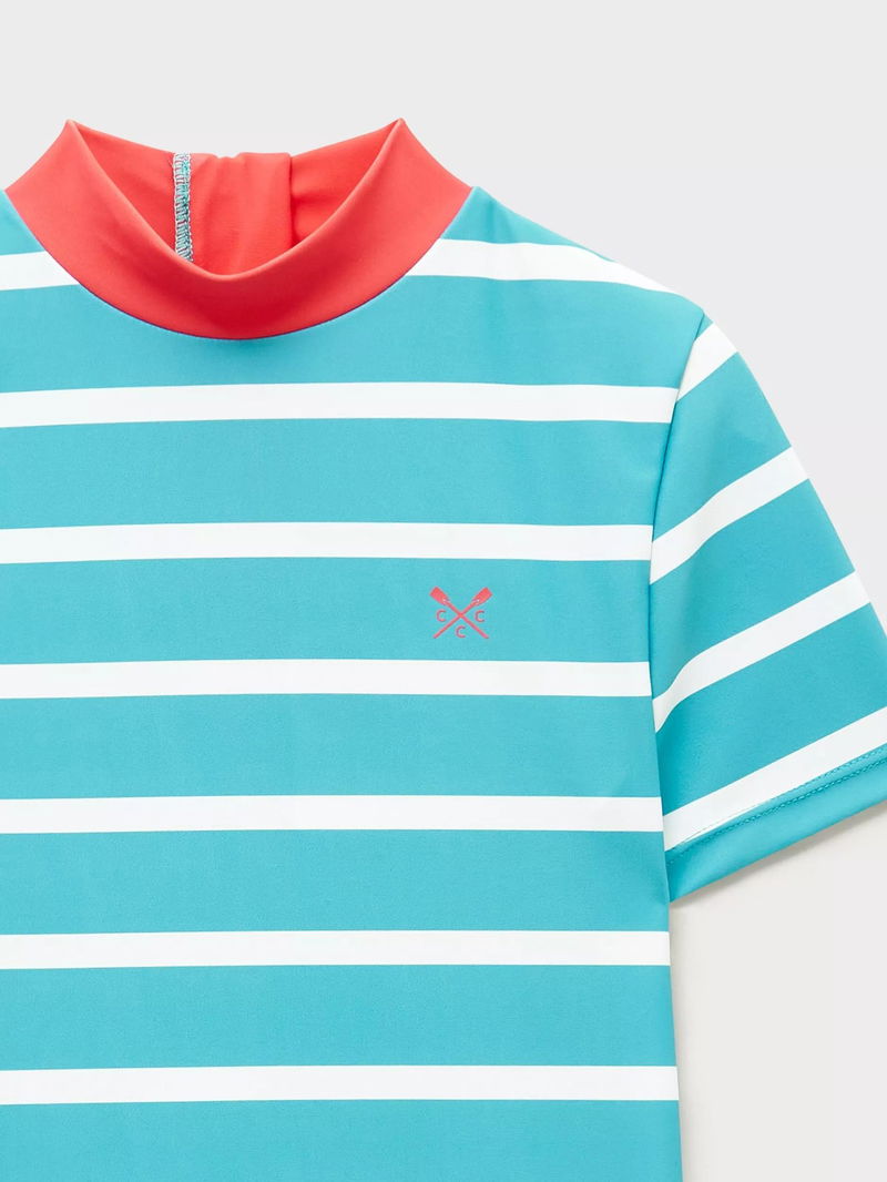 A rash vest in green and white stripes, with a contrast red neckline. Comfortable and stretchy with a zip fastening, this long-sleeved rash vest is complete with the crossed oars on the chest for the perfect finishing touch. Just add swim shorts.