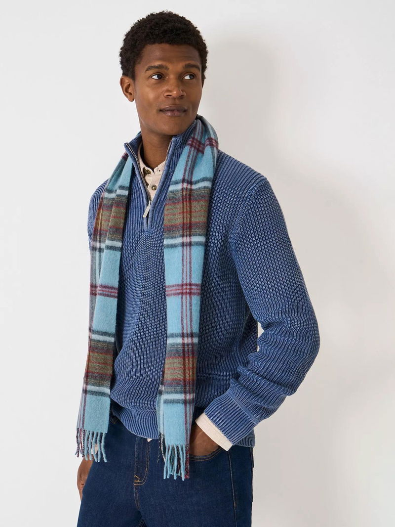 A supersoft wool scarf in blue and red check. Made from cosy lambswool, this durable, comfortable scarf is finished with a tassel trim and subtle Crew branding. Layer it on over a jumper or jacket. A refined classic that also makes a great gift.