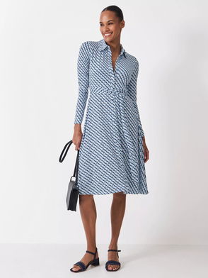 The Leah dress from Crew Clothing is made from floaty viscose, with an all-over geometric pattern. In a shift silhouette, it has a box pleat beneath the button placket for movement, elbow-length sleeves and a classic collar.