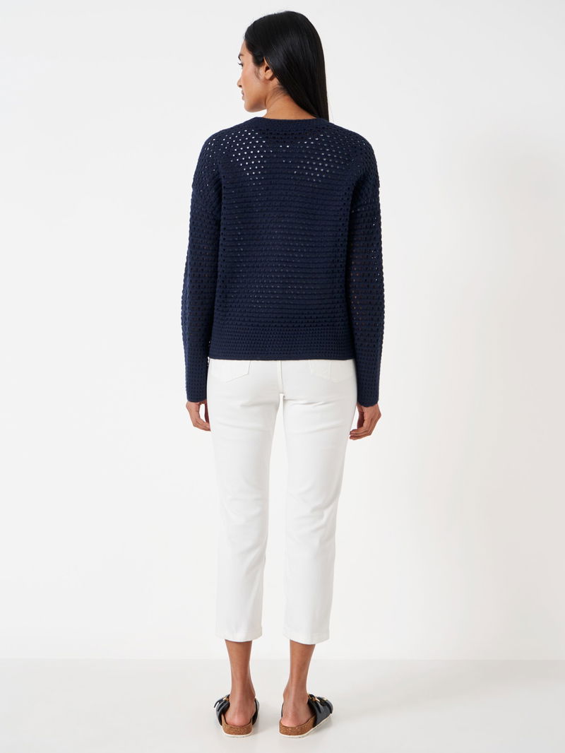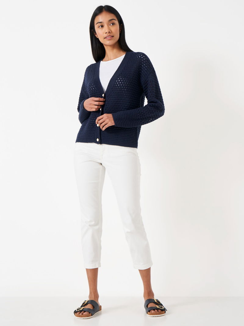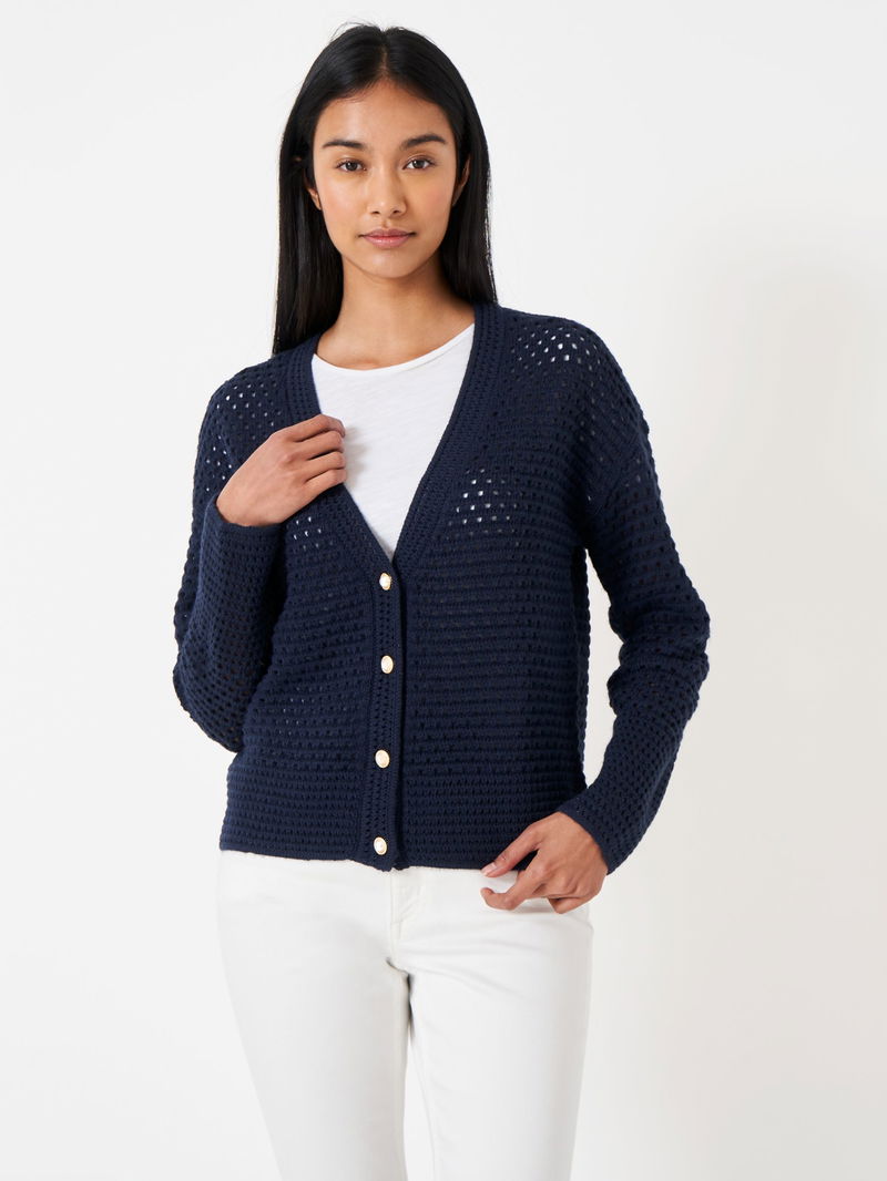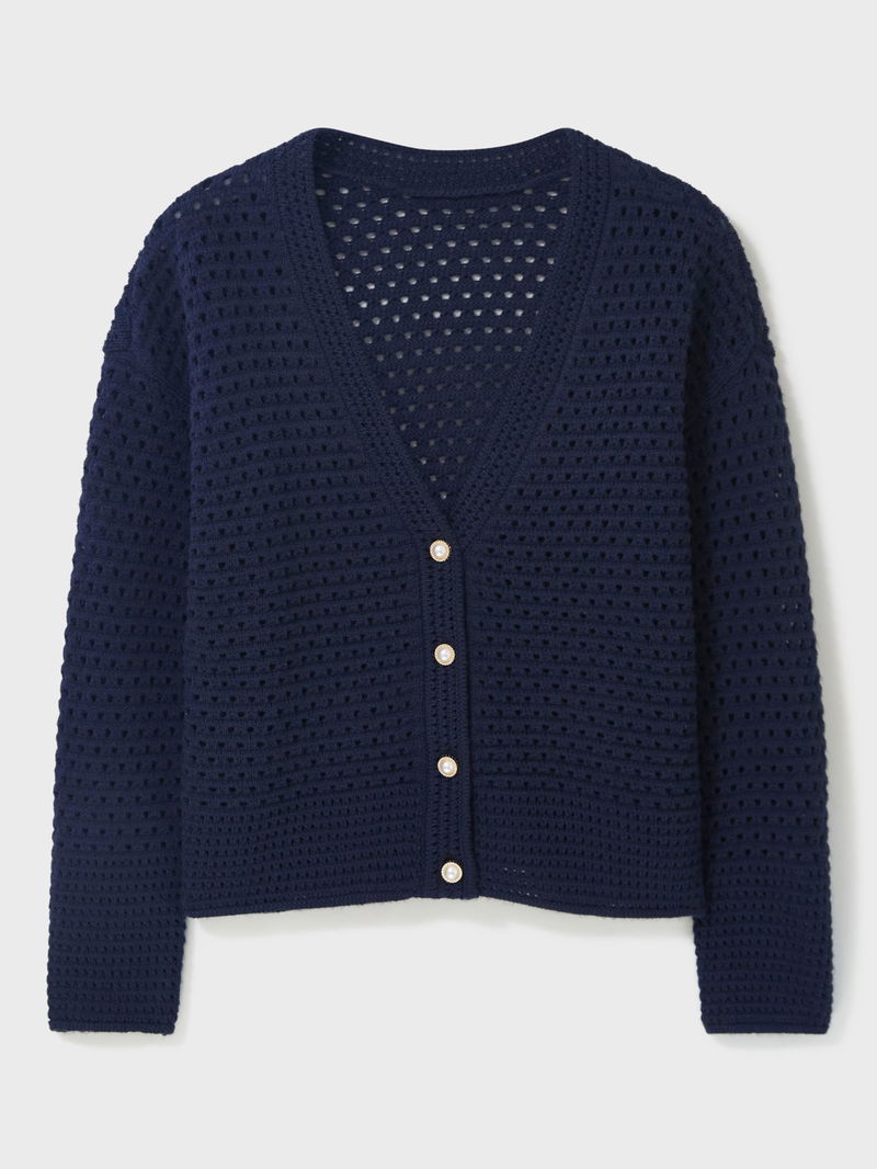 Say hello to Crew's pointelle cardigan in navy. Soon to be your favourite knit, this cardigan features mock pearl buttons and an all-over stitched pattern. We like it paired with jeans or draped over a dress. Effortless.