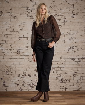 'Small and slow' London brand, Damson Madder's clothing is characterised by relaxed fits, feminine details and playful prints. Denim meets with ruffles, bows and embroidery, while cargo trousers might be rendered in an irreverent leopard print. Along with midi dresses, floral quilted jackets and oversized collar blouses, its gilets and long skirts are bestsellers.