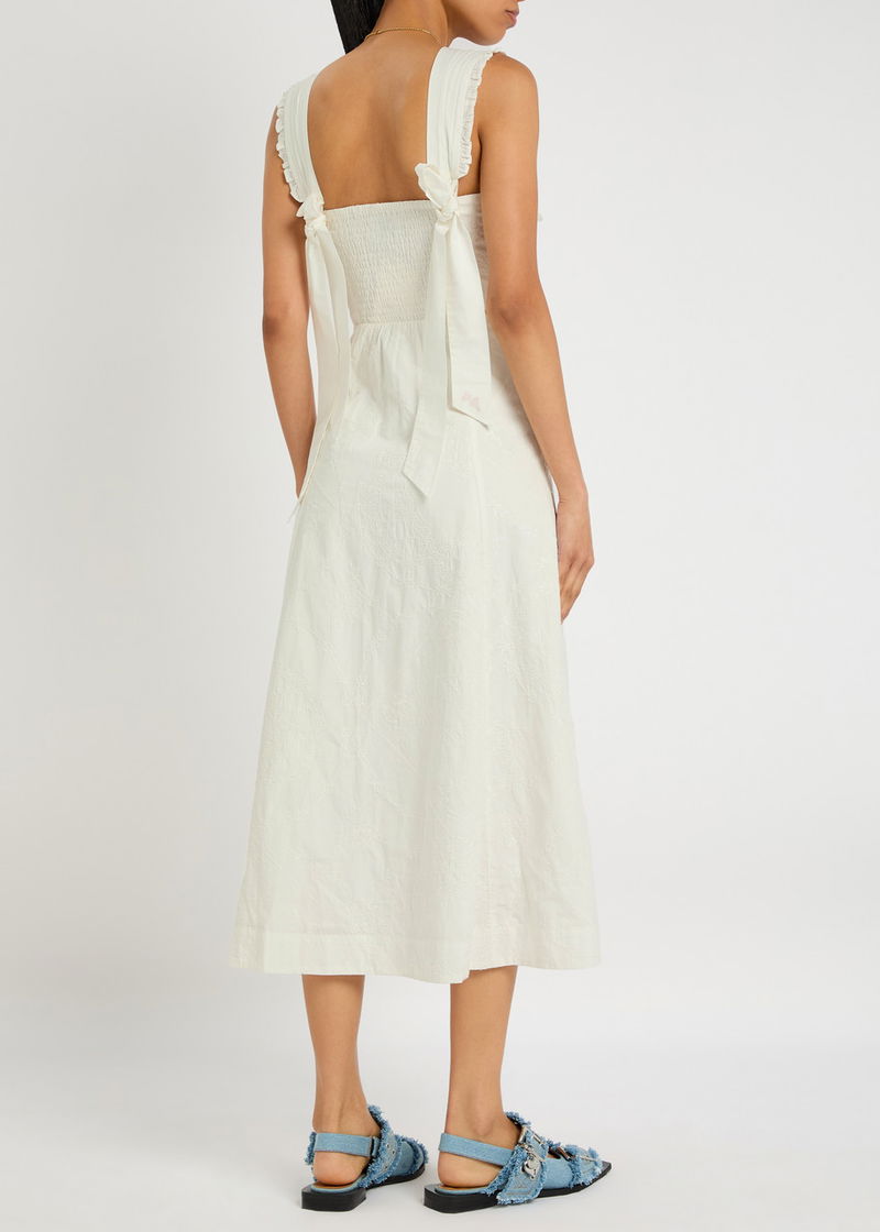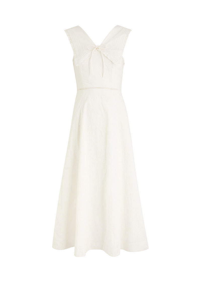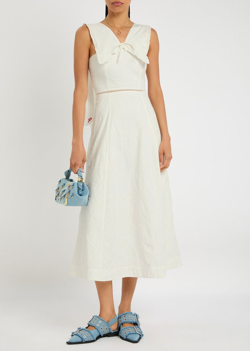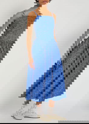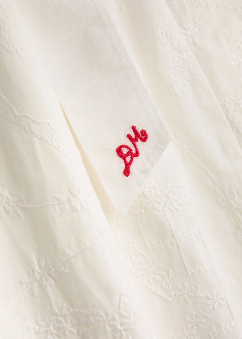 'Small and slow' London brand, Damson Madder's clothing is characterised by relaxed fits, feminine details and playful prints. Denim meets with ruffles, bows and embroidery, while cargo trousers might be rendered in an irreverent leopard print. Along with midi dresses, floral quilted jackets and oversized collar blouses, its gilets and long skirts are bestsellers.