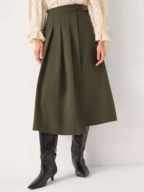 So classic and academia-inspired, this wrap-style skirt from Damson Madder features a knee-length fit with off-set closure, removable tie belt, and pleating at the side for added shape.