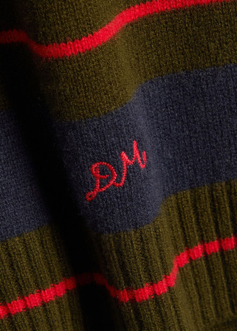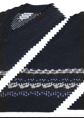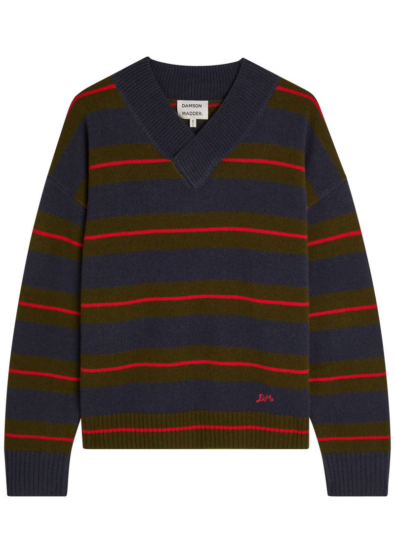 Damson Madder wool jumper. Striped, v-neck, dropped shoulders, logo embroidery at front, ribbed hem.