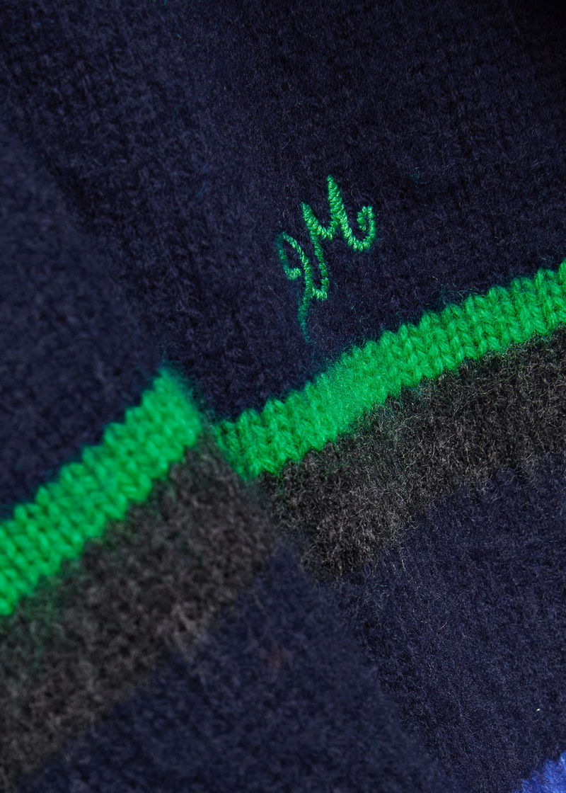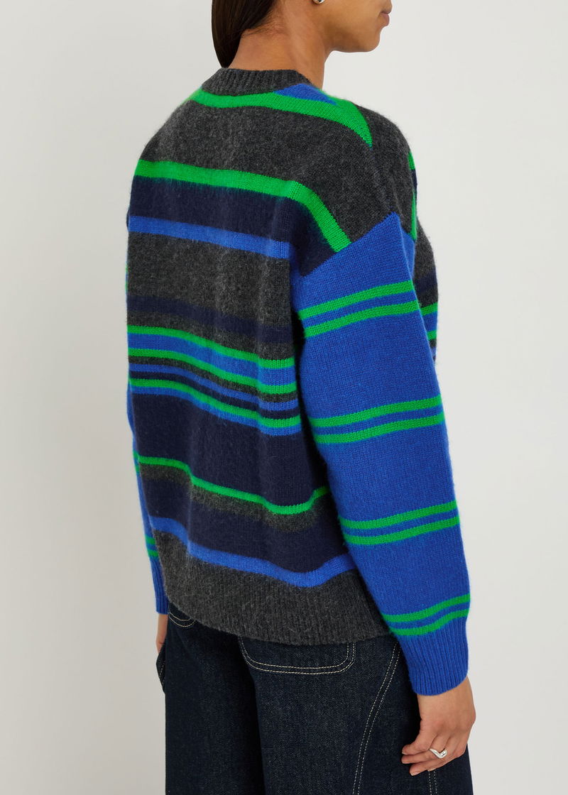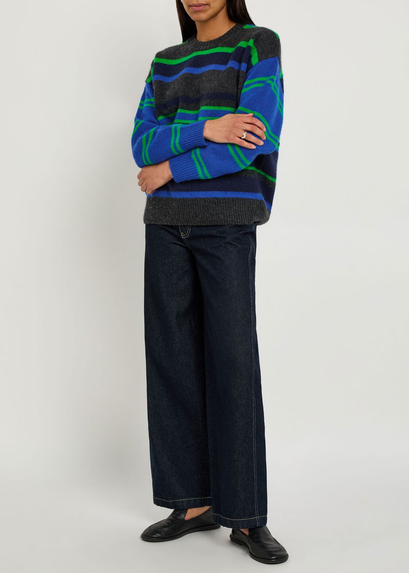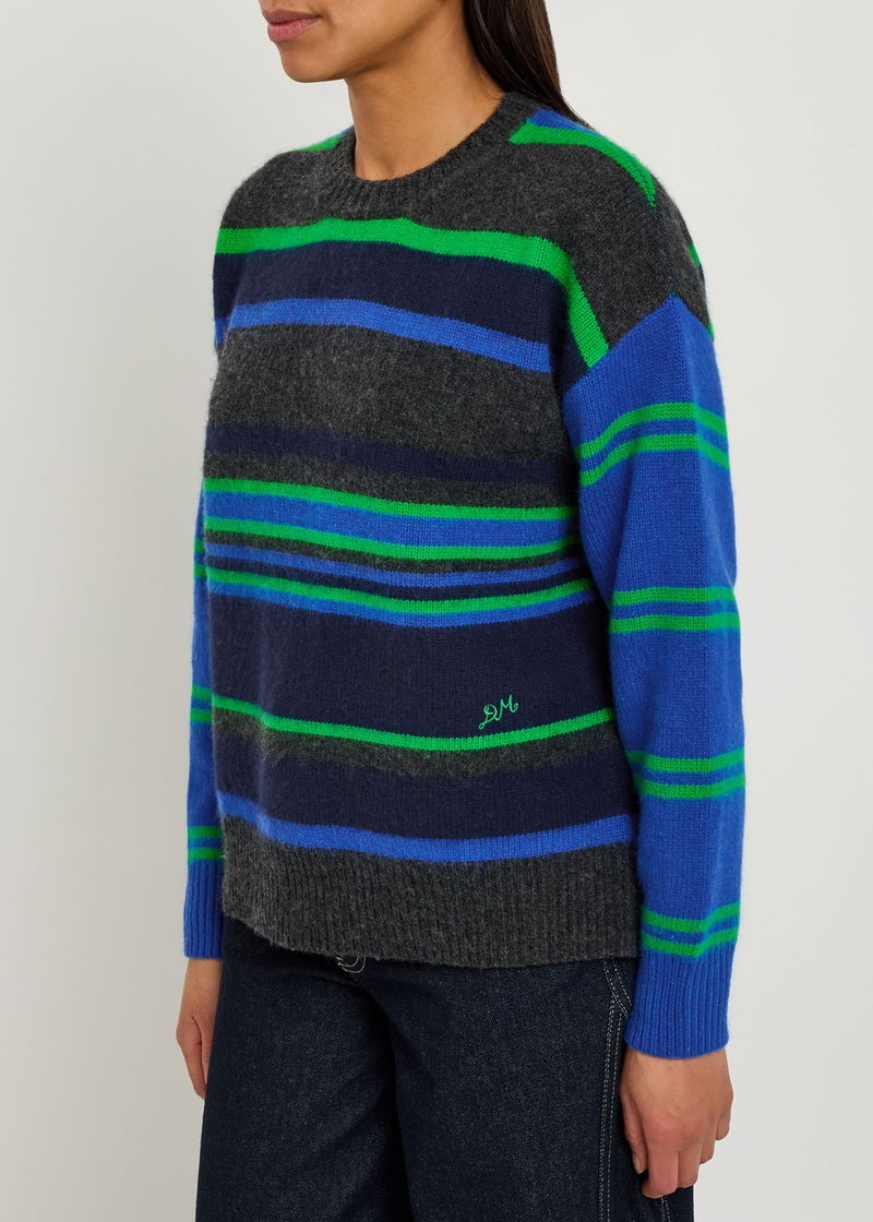 Damson Madder merino wool jumper. Striped, crew-neck, dropped shoulders, embroidered logo, ribbed trims. Slips on.
