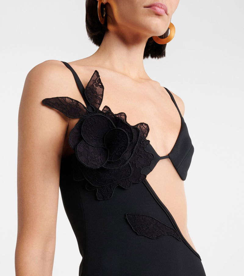 David Koma's glamorous styles are the key to making an entrance when it matters the most. This asymmetric midi dress features a built-in bustier, a tulle insert cutout at the waist, complete with a floral-appliqué.