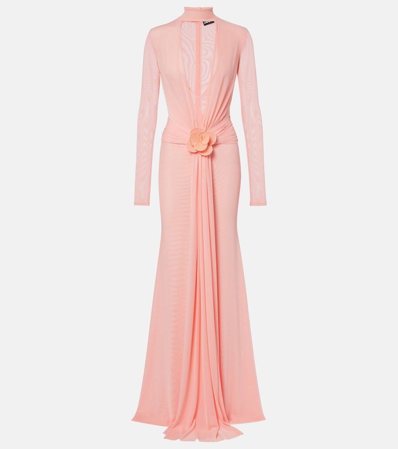 Draped Floral-appliqué Mesh Gown
