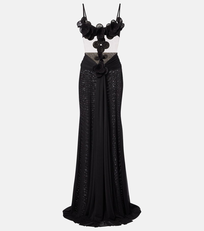 Floral-appliqué Mesh Gown