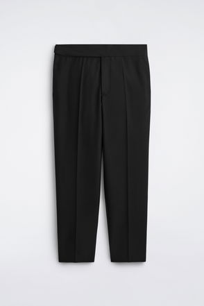Flared pants, Cotton and wool-blend, Stitched front creases, Back flap pocket, Front slant pockets, High-rise cut, Two back splits, Concealed hook and zip fastening at side, Mid-weight, non-stretchy fabric.