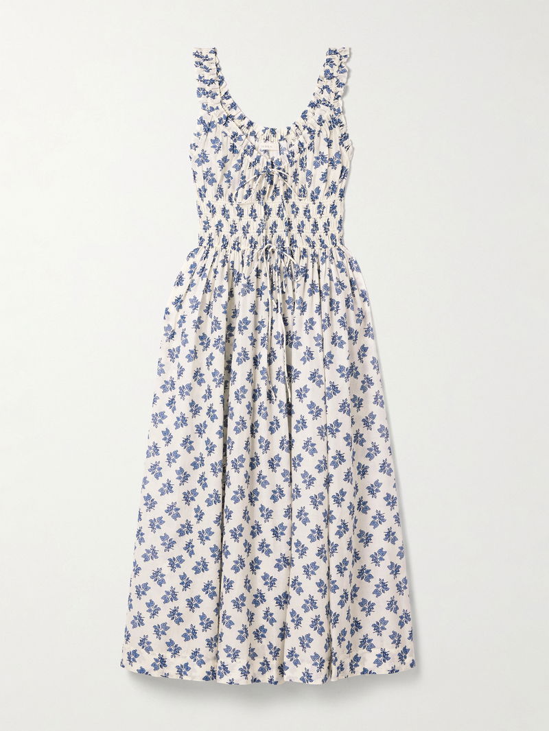 DÔEN's clothing is characterized by its feminine details and playful floral prints. Showcasing both, this 'Emmaretta' midi dress is made from organic cotton-voile patterned with cheery blooms and has a shirred bodice with slim, adjustable ties. The ruffled straps and floaty skirt create nice dimension.