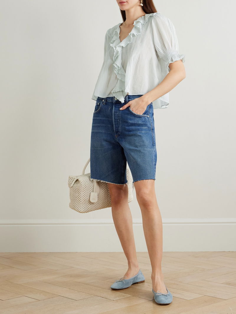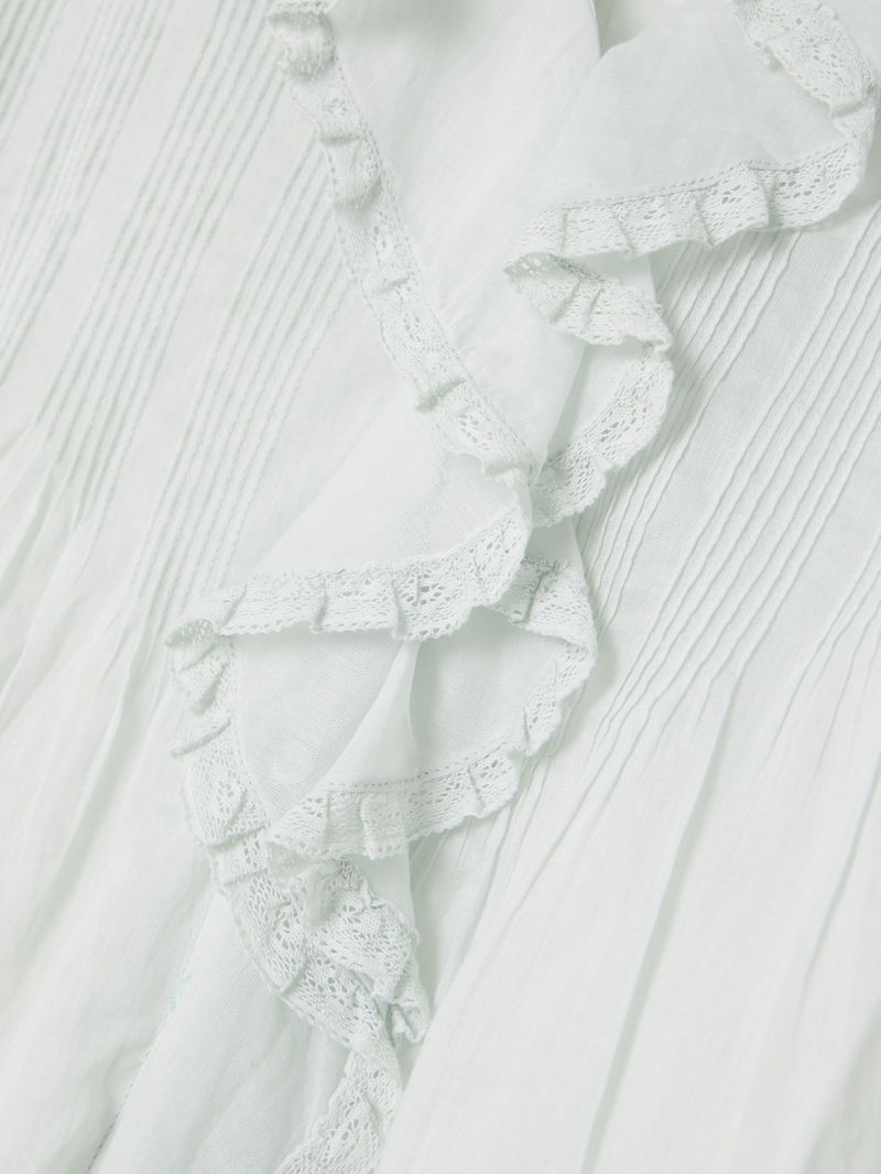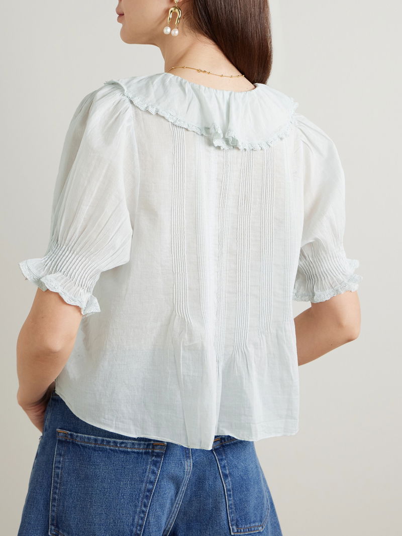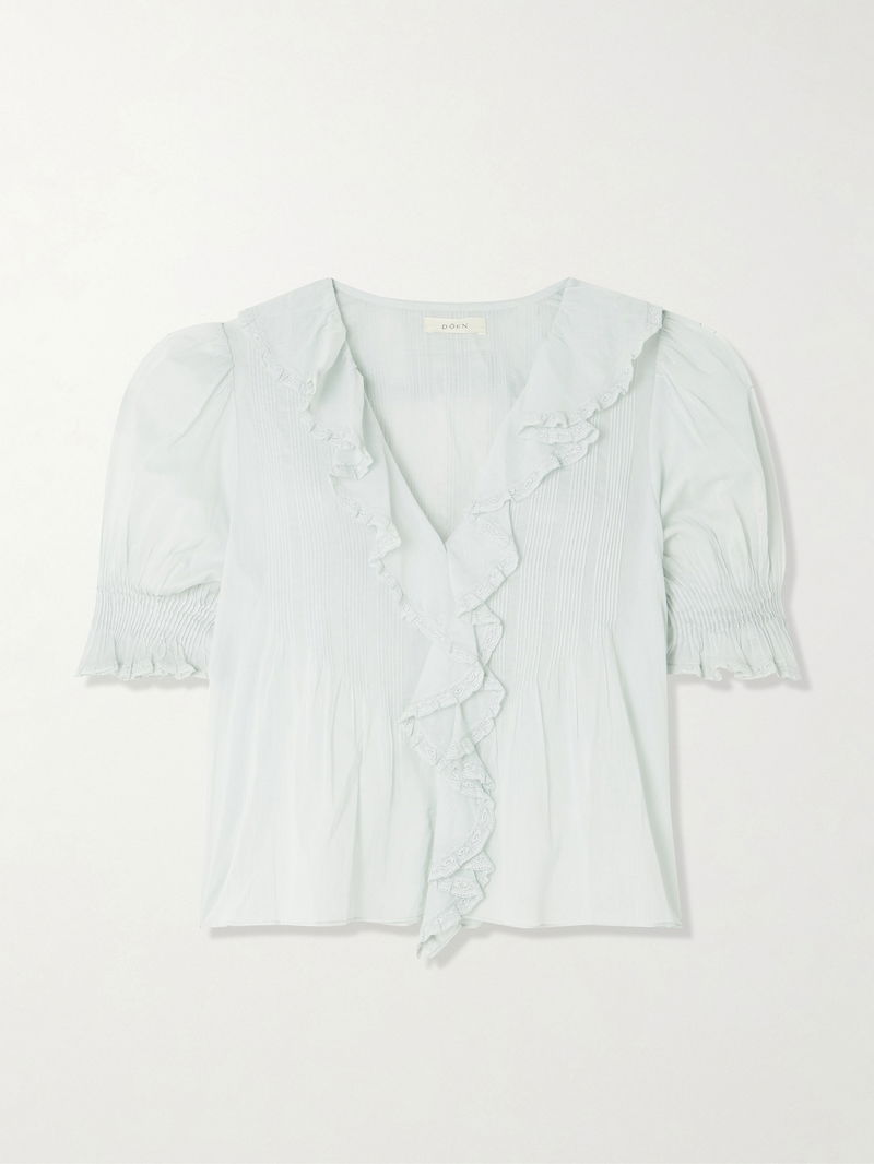 DÔEN's 'Henri' top is a lovely confection of ruffles and pintucks. Made from organic cotton-voile that's grown without the use of harmful pesticides and synthetic fertilizers, it has smocked puffed sleeves and flouncy ruffles tracing the lace-trimmed neckline. It looks sweet styled with straight-leg jeans.