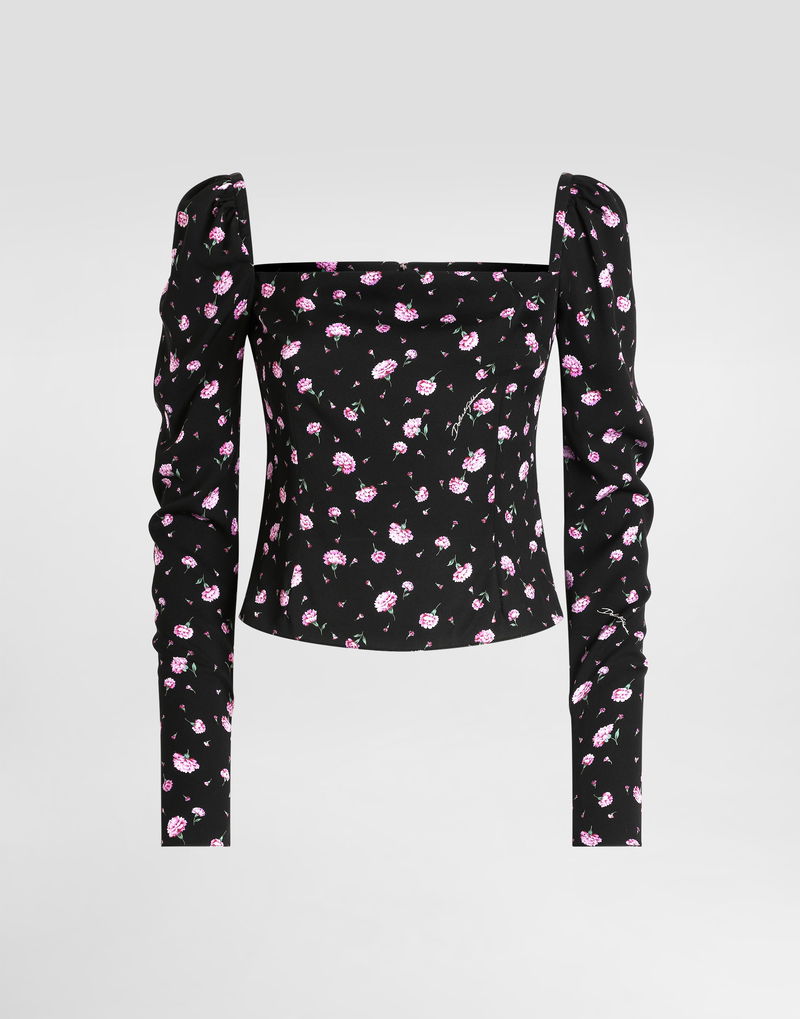 Carnations-print silk top: Multi-colored Straight neckline Vertical waist darts Gigot sleeves fitted at the bottom Invisible zip at the bottom of the sleeves Invisible zip at center back Unlined The model is 175 cm tall and wears size 40 IT Made in Italy The difference in the print placement that you may find on this product is a feature of Dolce & Gabbana’s “Handmade” pieces. A detail that makes every garment or accessory unique and exclusive.