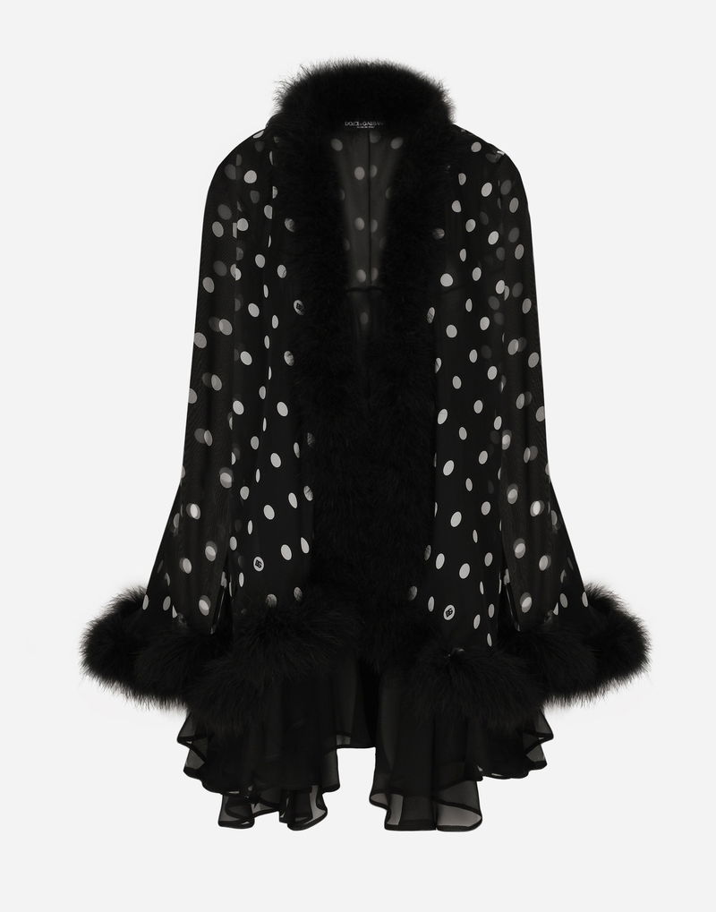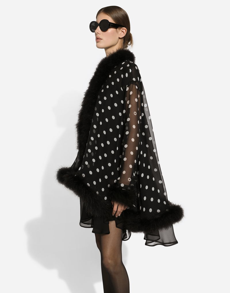 Chiffon Cape With Polka-dot Print And Marabou Trim