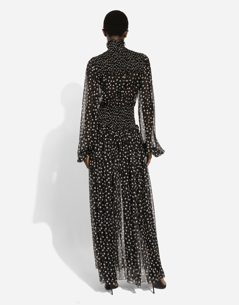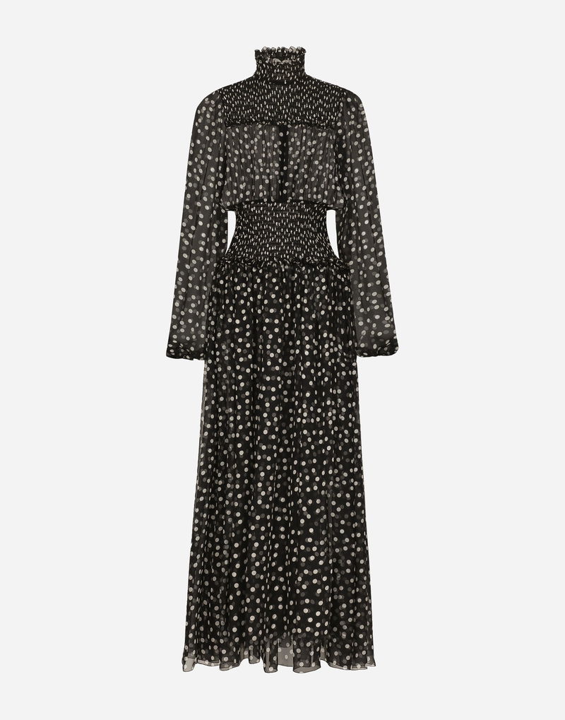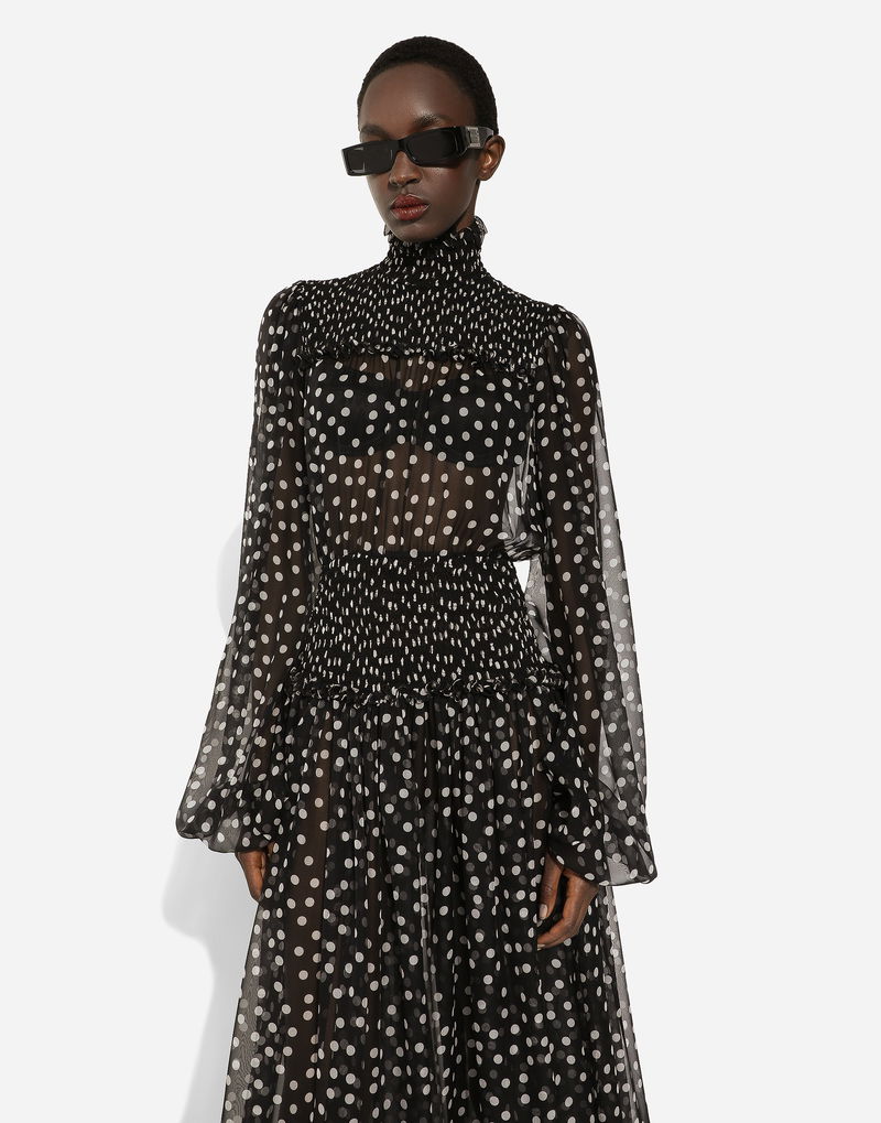Chiffon Midi Dress With Smock Stitching And Micro-polka Dot Print