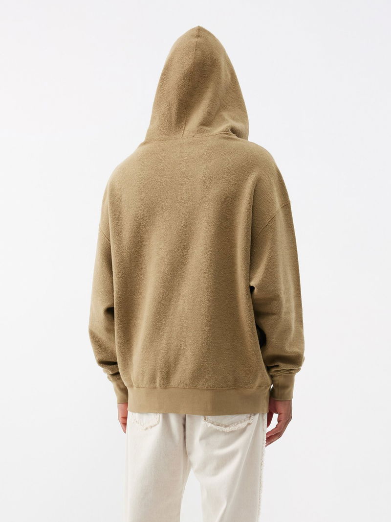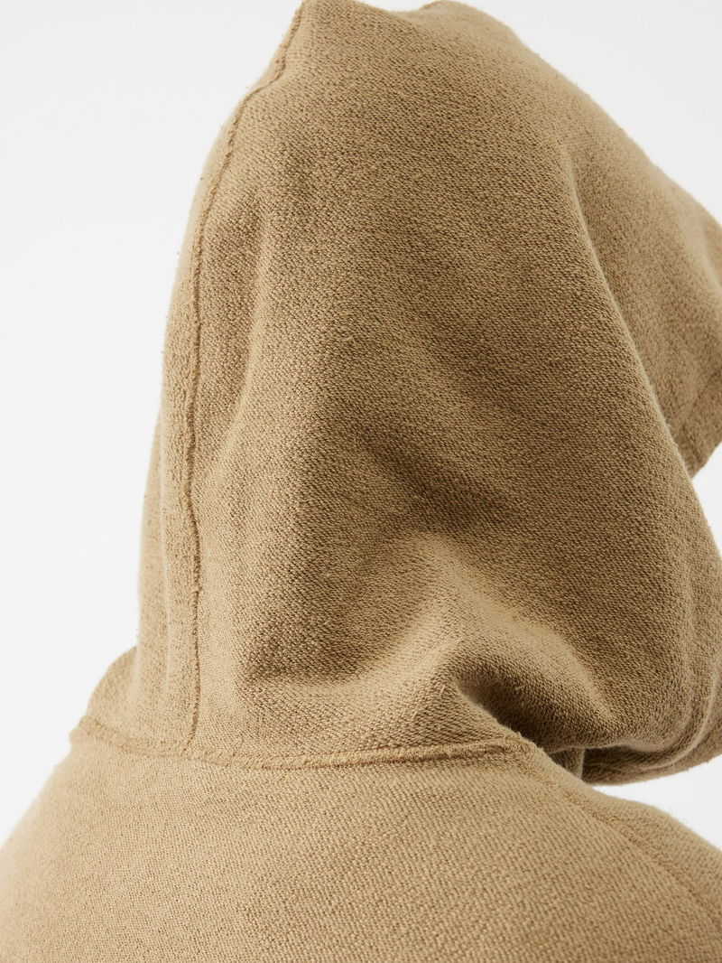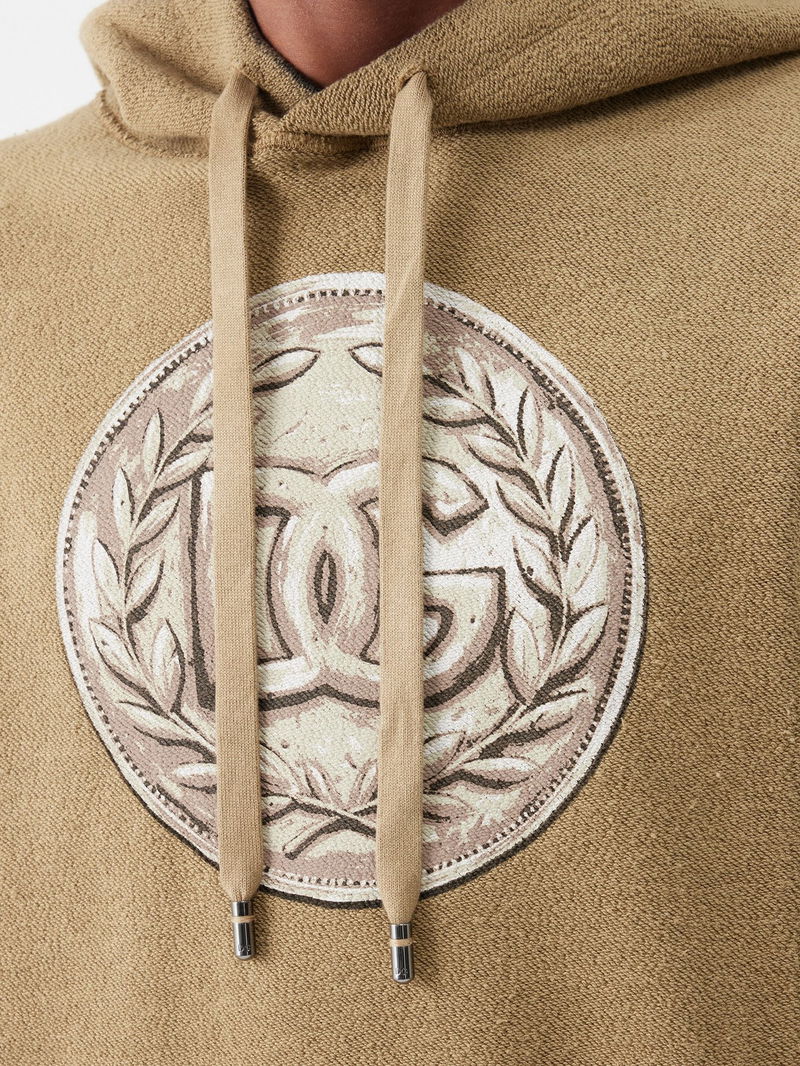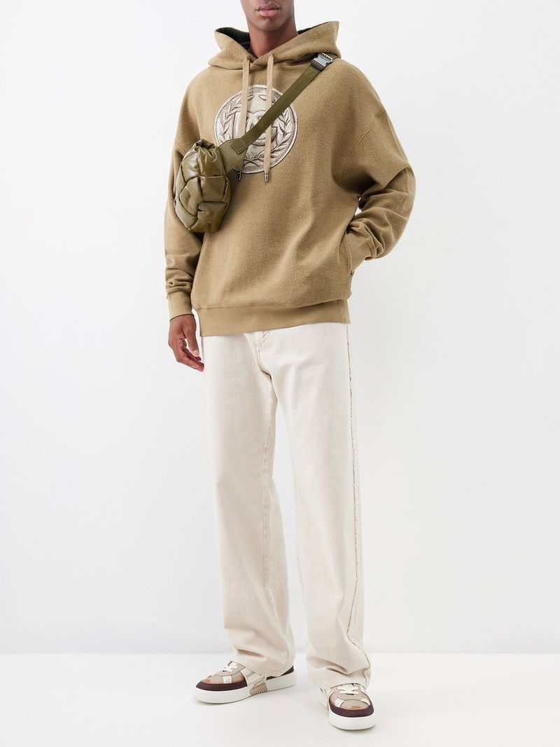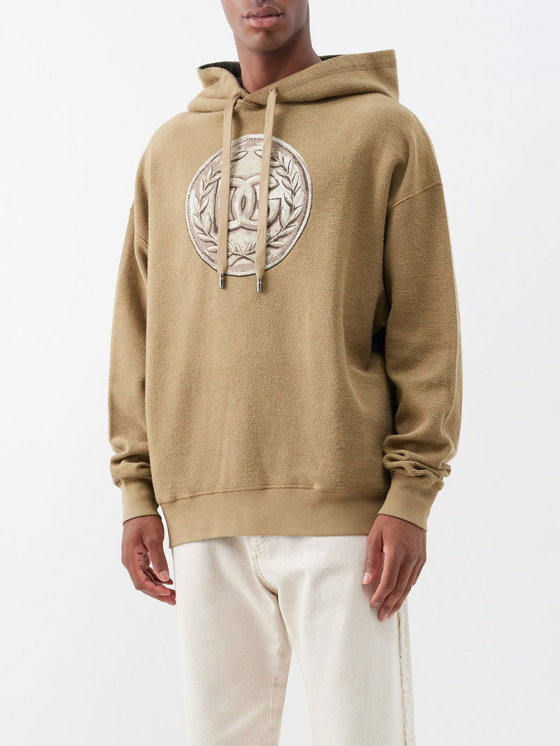 A Roman-style logo coin is printed on Dolce & Gabbana’s beige hoodie, cut in Italy from soft cotton fleece with languid dropped shoulders.