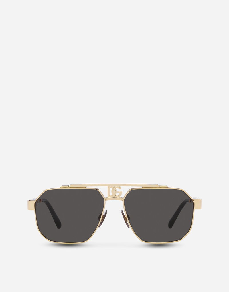Gold metal frame Gold metal temples Dark grey lenses 100% UV protection Size lens - bridge - temple: 59- 15 - 145 mm Fitting: Adjustable nosepads Packaging: Istitutional Made in Italy
