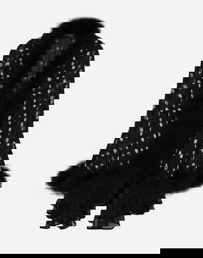 Feather-trimmed cape.
