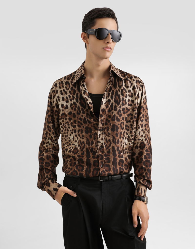 Leopard-print twill shirt: Multi-colored Gold shape Long sleeves Beveled cuff The model is 185 cm tall and wears size 48 IT Made in Italy The difference in the print placement that you may find on this product is a feature of Dolce & Gabbana’s “Handmade” pieces. A detail that makes every garment or accessory unique and exclusive.