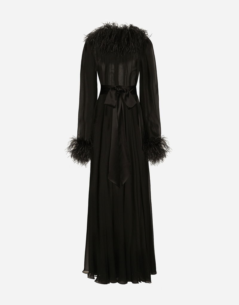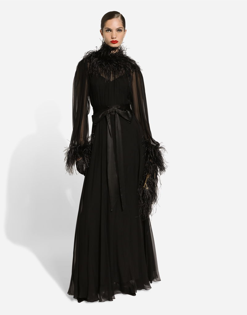 Long Silk Chiffon Dress With Ostrich Feather Details