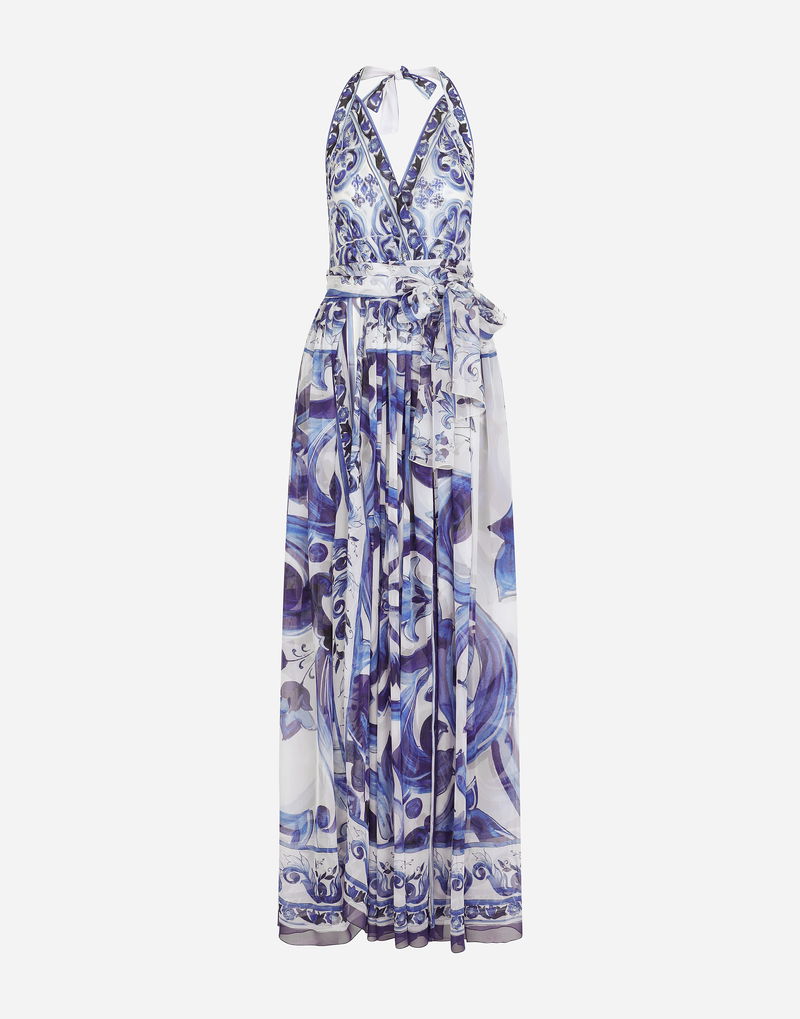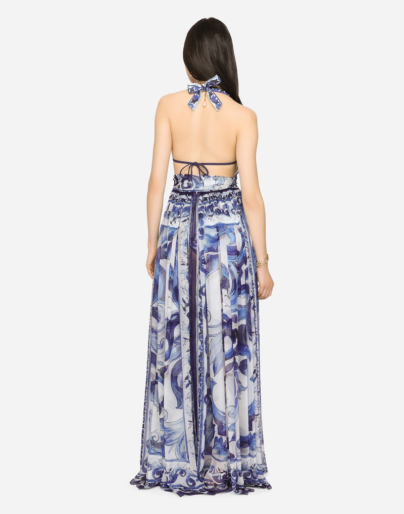 Long Sleeveless Silk Chiffon Dress With Majolica Print