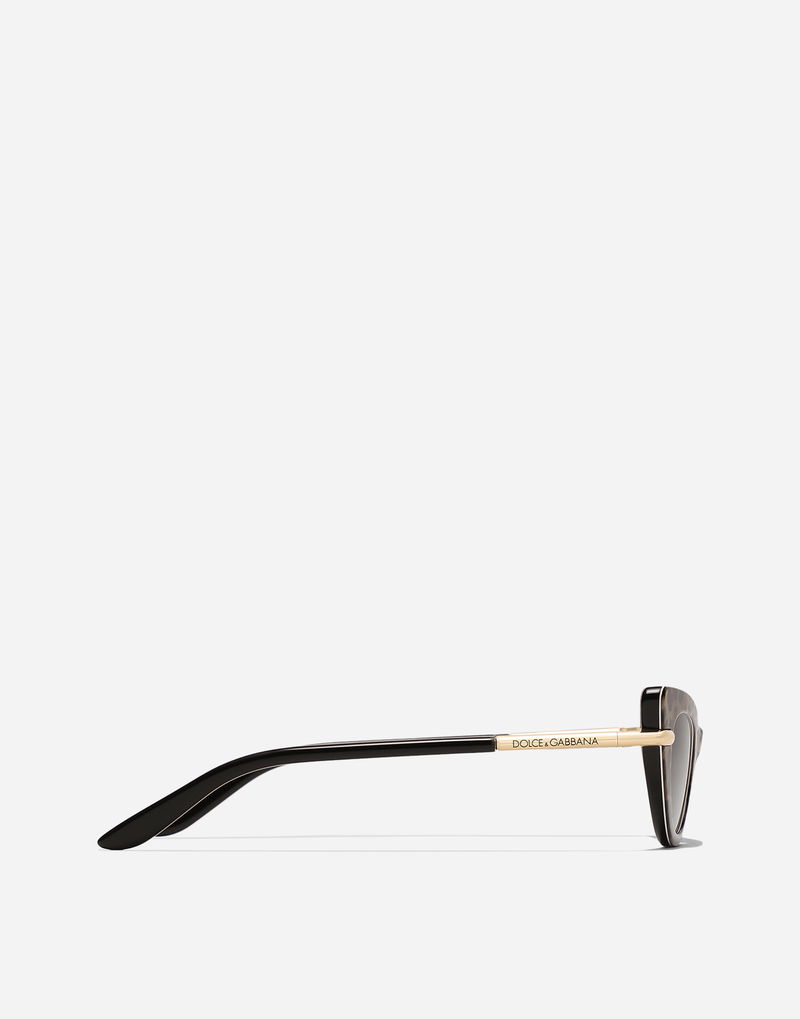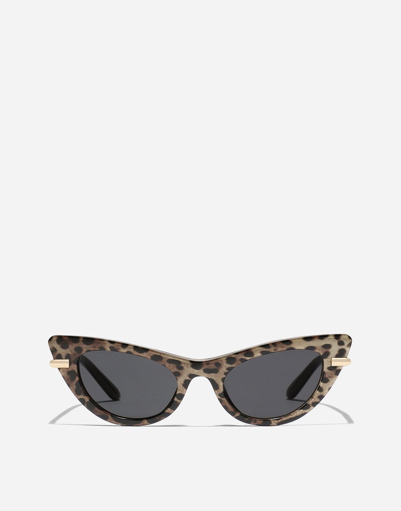 Leopard print acetate frame Gold metal temples. Dark grey lenses. 100% UV protection.