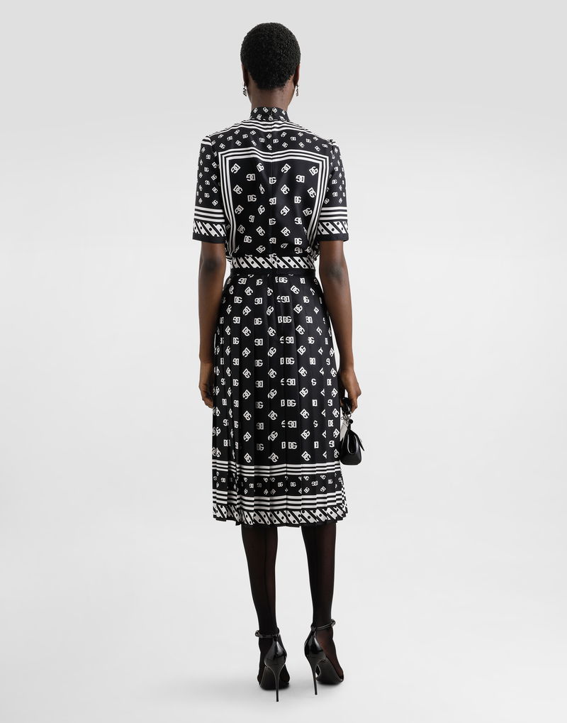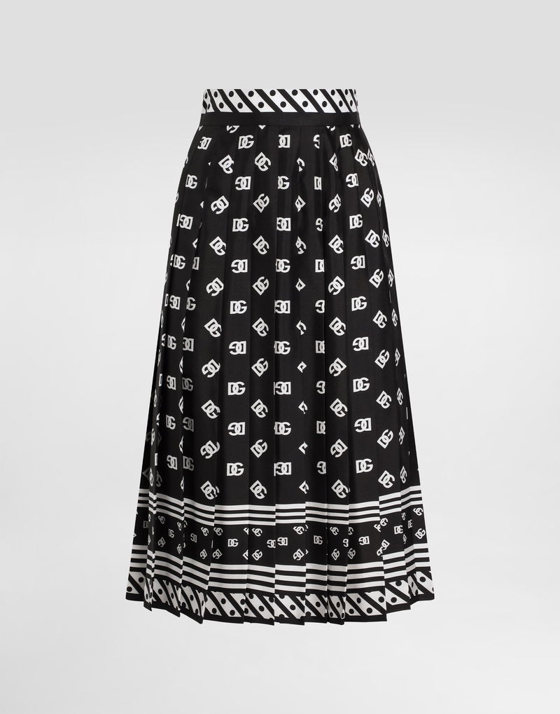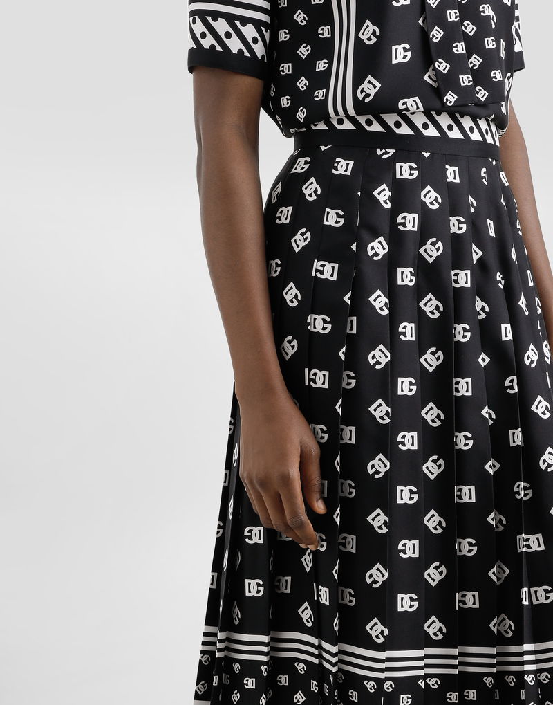 Pleated Silk Twill Calf-length Skirt With All-over DG Logo Scarf Print