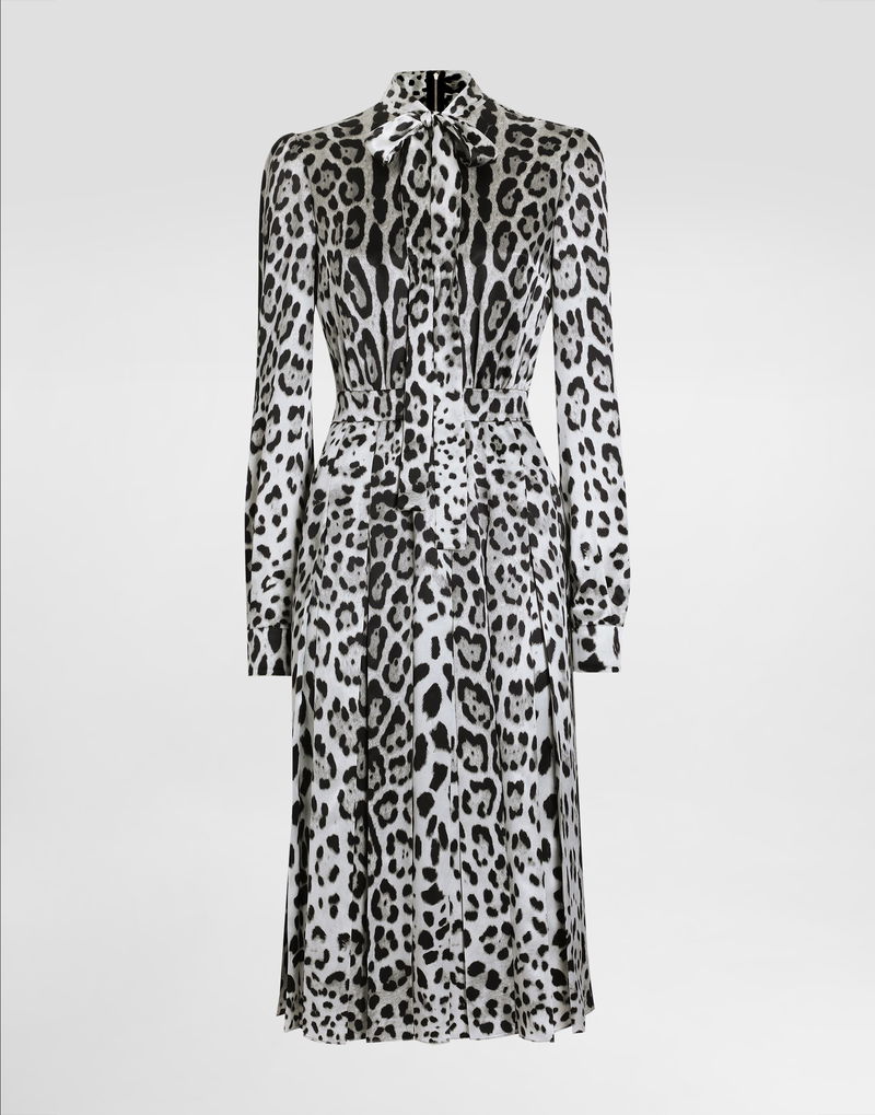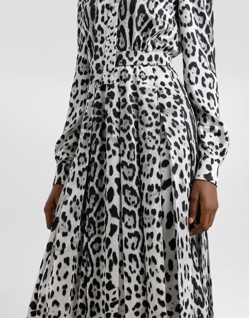 Satin Calf-length Shirt Dress With Pussy-bow And Leopard Print