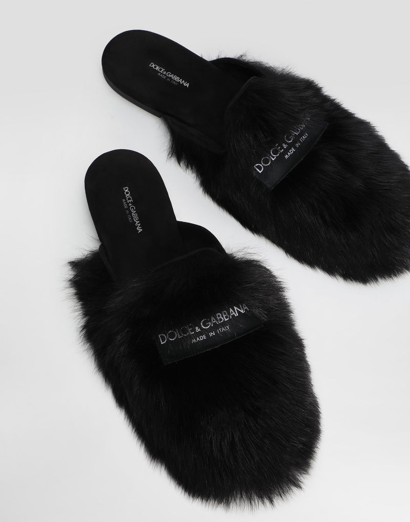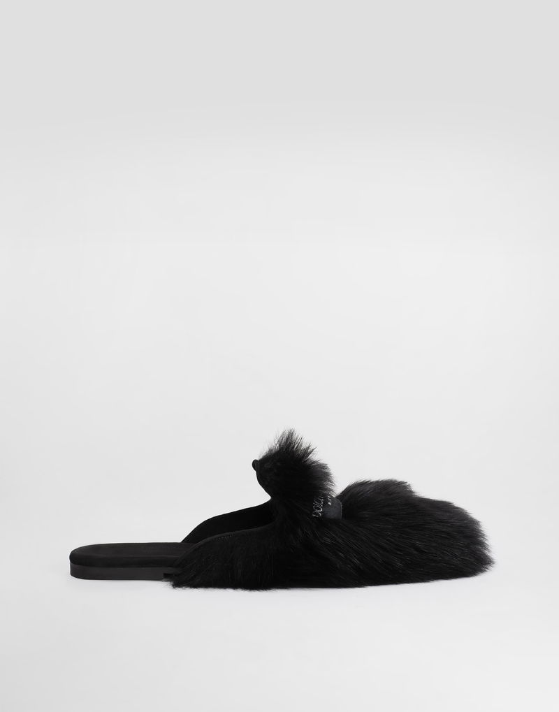 Shearling and suede slippers: Black Young Princess shape TPU outsole Texon insole Drop-shaped suede heel pad insole customized with fire stamp Dolce & Gabbana large label Item equipped with a black cotton bag and a black embossed box .
