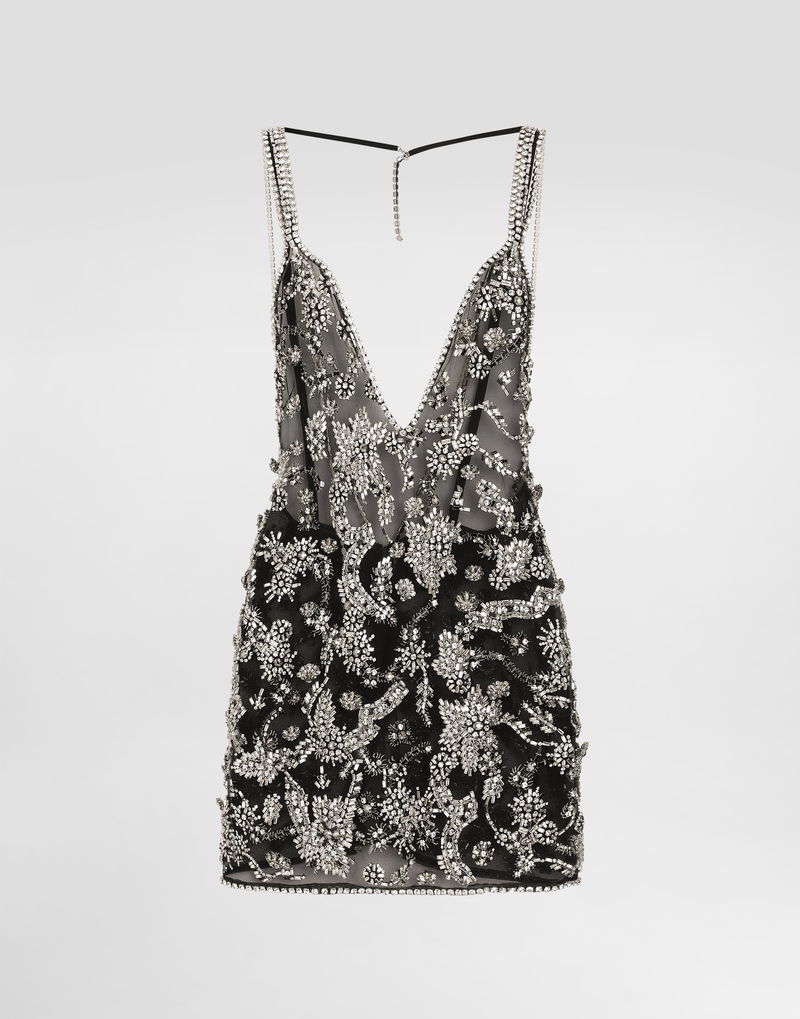 Short embroidered tulle dress: Multi-colored Flared fit V-neckline in front Deep back neckline Thin crisscross straps Invisible zip opening Organza canvas Length from waist 45 cm on size 40 IT The model is 175 cm tall and wears size 40 IT Made in Italy