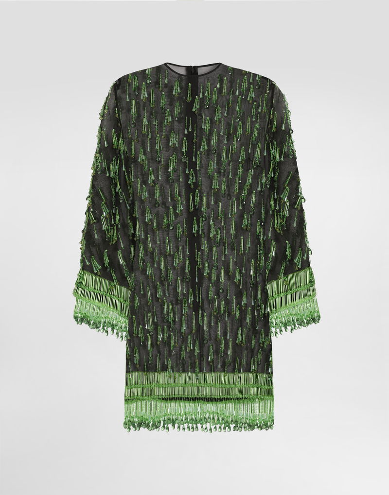 Short flared organza dress with embroidery: Multi-colored 3/4 sleeves Concealed zipper closure at center back With slip.