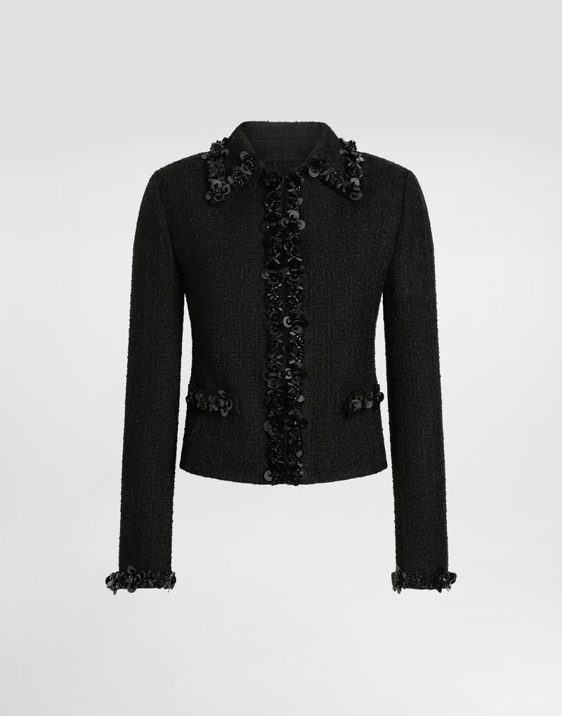 Short jacket in stretch mat: Black Faux welt pockets. Long sleeves. Closure with hooks. Unlined, canvassed with tulle.