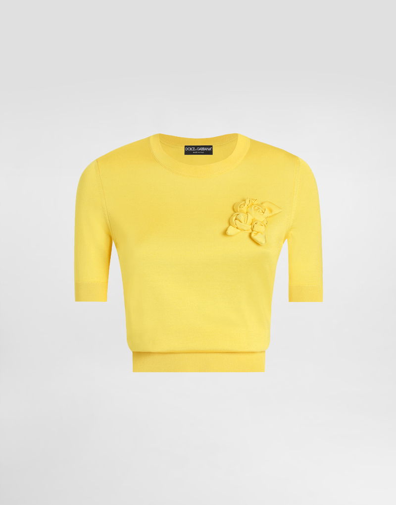 Short-sleeved Silk Sweater With Flower Embellishment