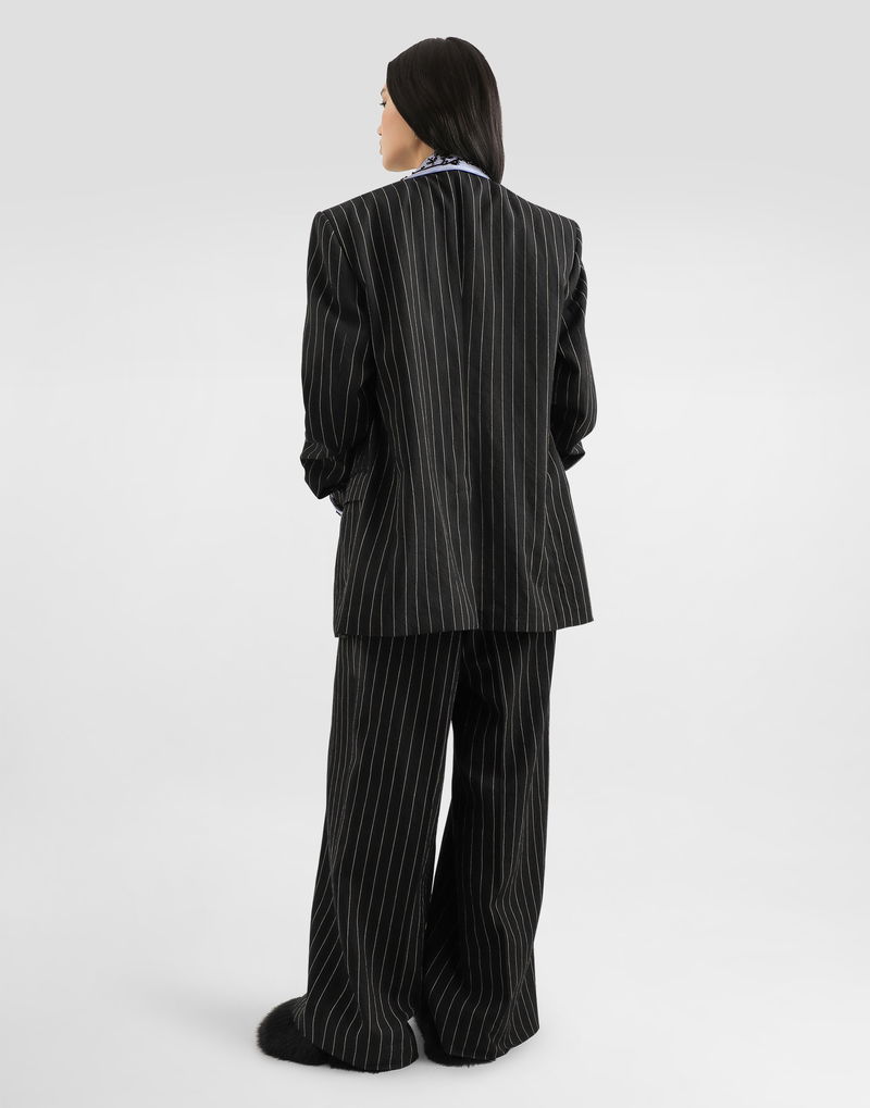 Single-breasted pinstripe jacket in wool and linen: Multi-colored Sicilia shape with strong chest and low shoulder Notched lapels Two-button closure Semi-canvassed, unlined.