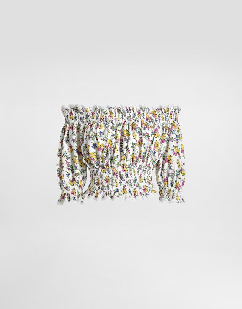 Small floral-print poplin top: Multi-colored Off-the-shoulder Elbow-length sleeves Smocked waistband lace beading applied. The difference in the print placement that you may find on this product is a feature of Dolce & Gabbana’s “Handmade” pieces. A detail that makes every garment or accessory unique and exclusive.
