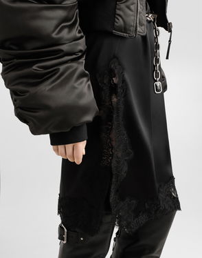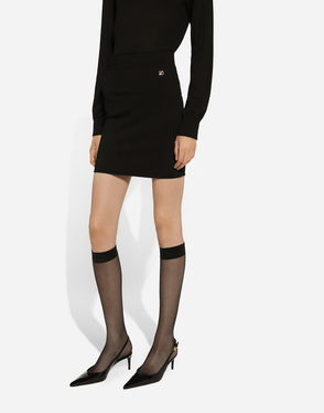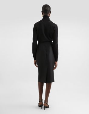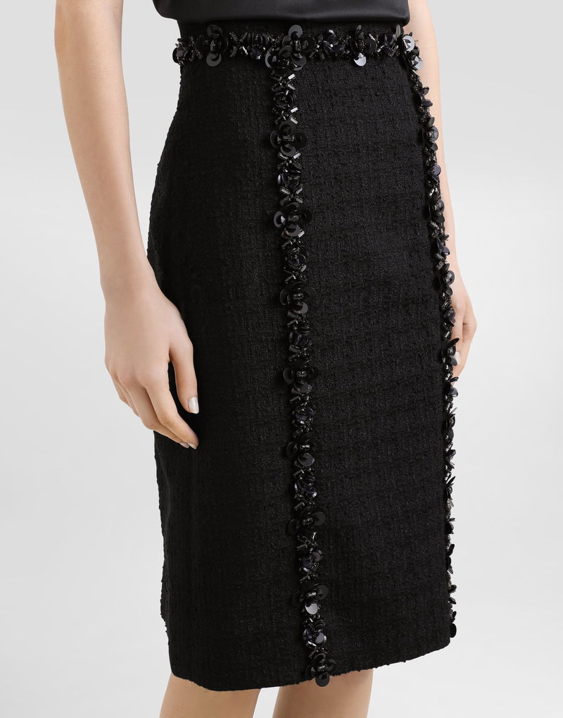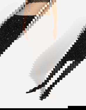 Stretch mat sheath skirt: Black Zip at the center back Embroidered edges at the hem of the waistband and on the front cuts Doubled with tulle Length 60 cm from the waist on size 40 IT The model is 175 cm tall and wears size 40 IT Made in Italy