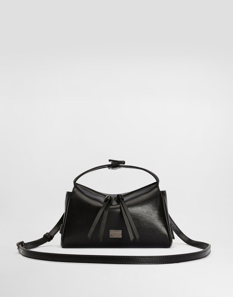 Mini Vittoria handbag in Calfskin: Black Leather handle and adjustable and removable leather shoulder strap Zip closure Vintage brass plating External customization with monogalvanic plate Internal customization with stamp with film Inner flat pocket Item equipped with a logo bag and a pre-assembled box Measurements: H12 x W19.5 x D8.5 cm Can hold keys, card holder and phone Made in Italy
