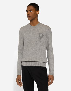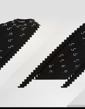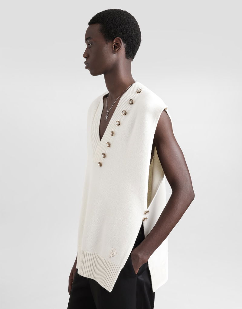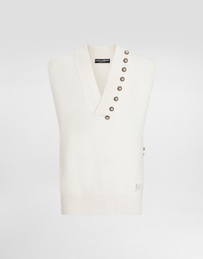 Wool V-neck vest with bejeweled buttons and DG logo embroidery.
