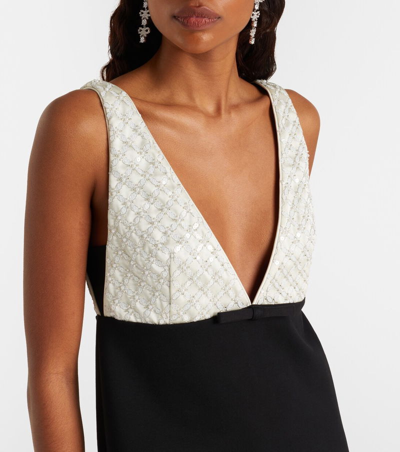 The Emotional Essence minidress from Dorothee Schumacher showcases a charming color contrast between the sequined bodice and the skirt. The design features a V-neckline finished with a sophisticated bow.