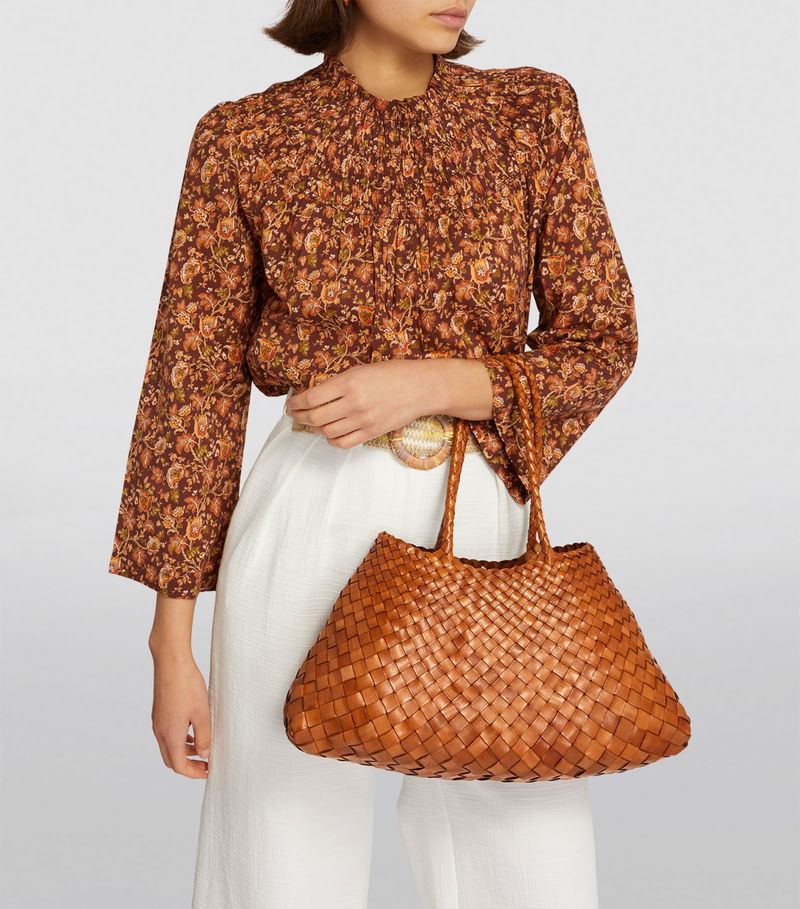 The Santa Croce tote bag presents an elegant silhouette through the use of asymmetric leather straps that taper to the brim, with traditional basket bag elements maintained as it's unlined and has an open top.