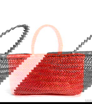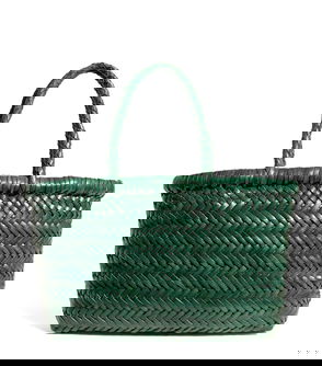 Dragon Diffusion's Egola line channels traditional basket weaving techniques into uniquely modern accessories, emblematically defined by irregularly woven leather strips. This smaller iteration has a versatile open top design that's ideal for all seasons, even offering a sneak peek at the antiqued St. Christopher medal charm sewn into its lining.