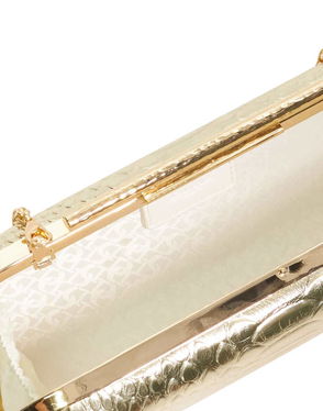 Worth the attention Clutch style Glitter finish Chain strap Push-lock closure.