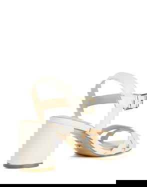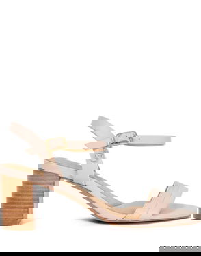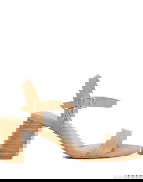Adjustable strap. Pin-buckle fastening. Open toe. Mid block heel.