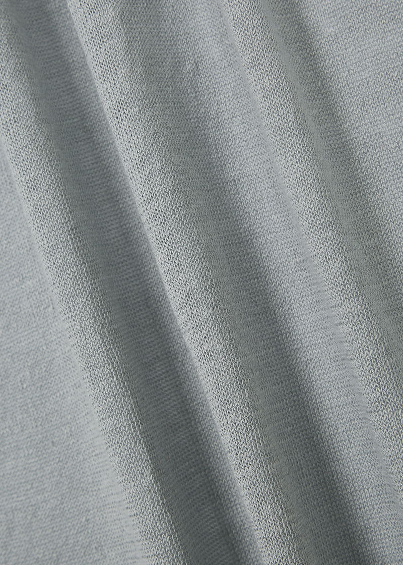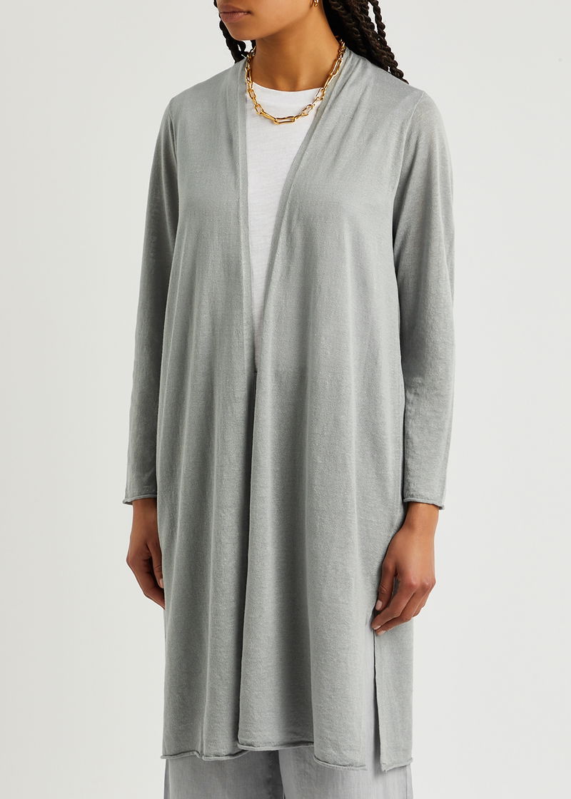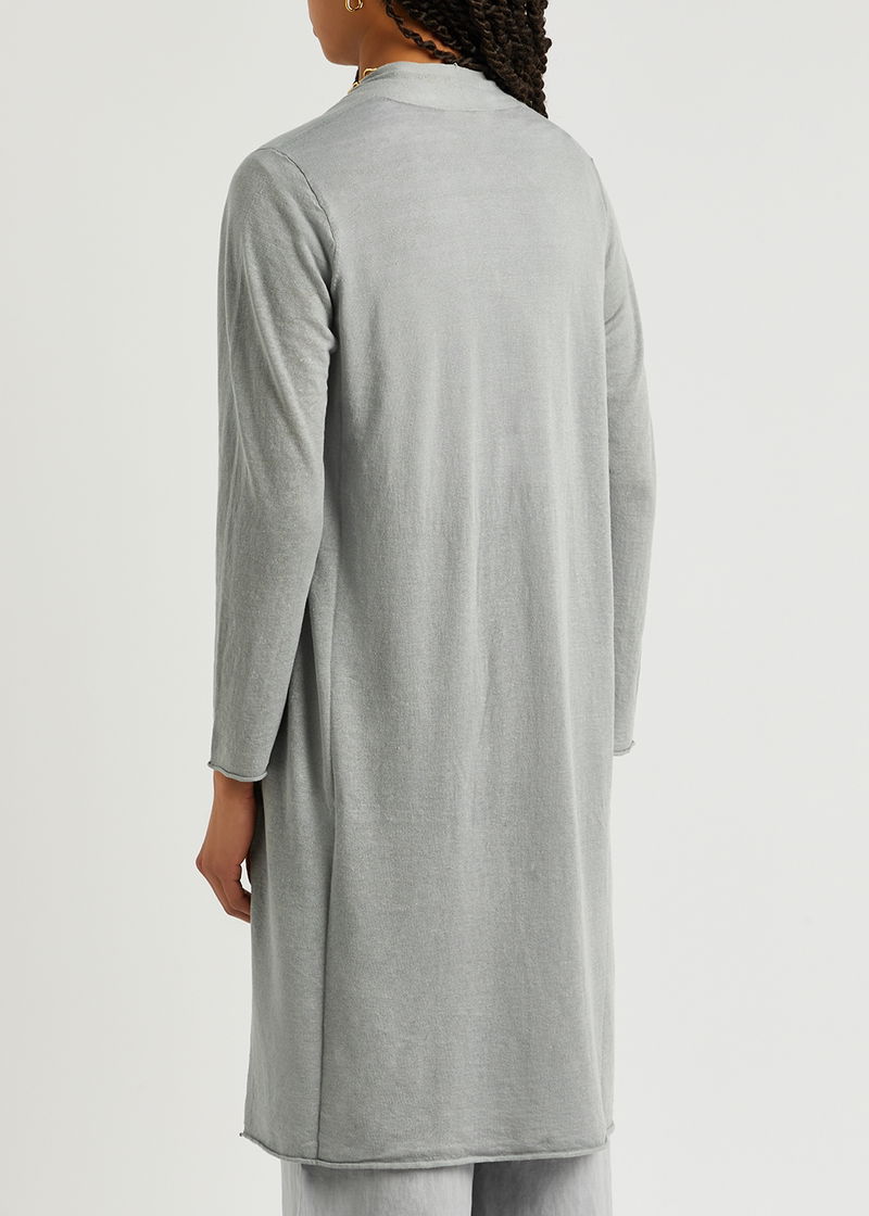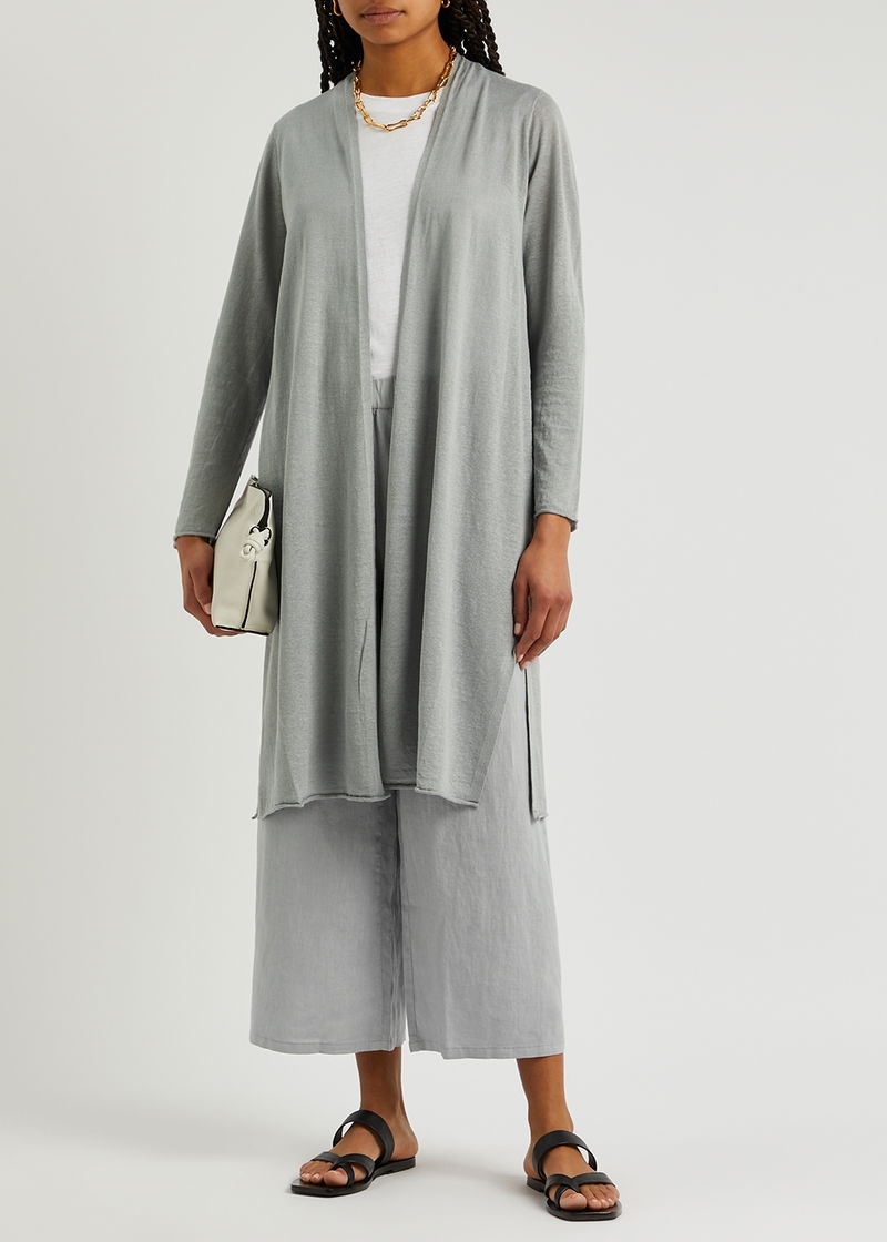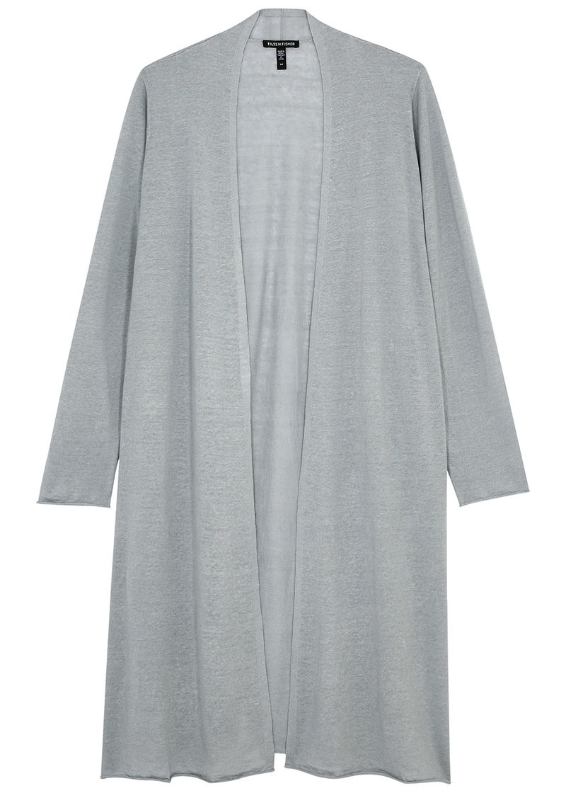 Eileen Fisher linen-blend cardigan. Dropped shoulders, side spits, rolled trims. Slips on.