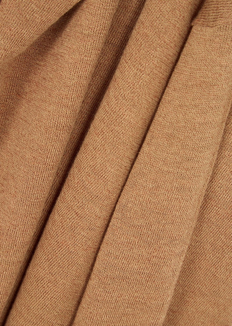 Eileen Fisher brown fine-knit linen-blend jumper. Wide neck, dropped shoulders, rolled trims. Slips on.