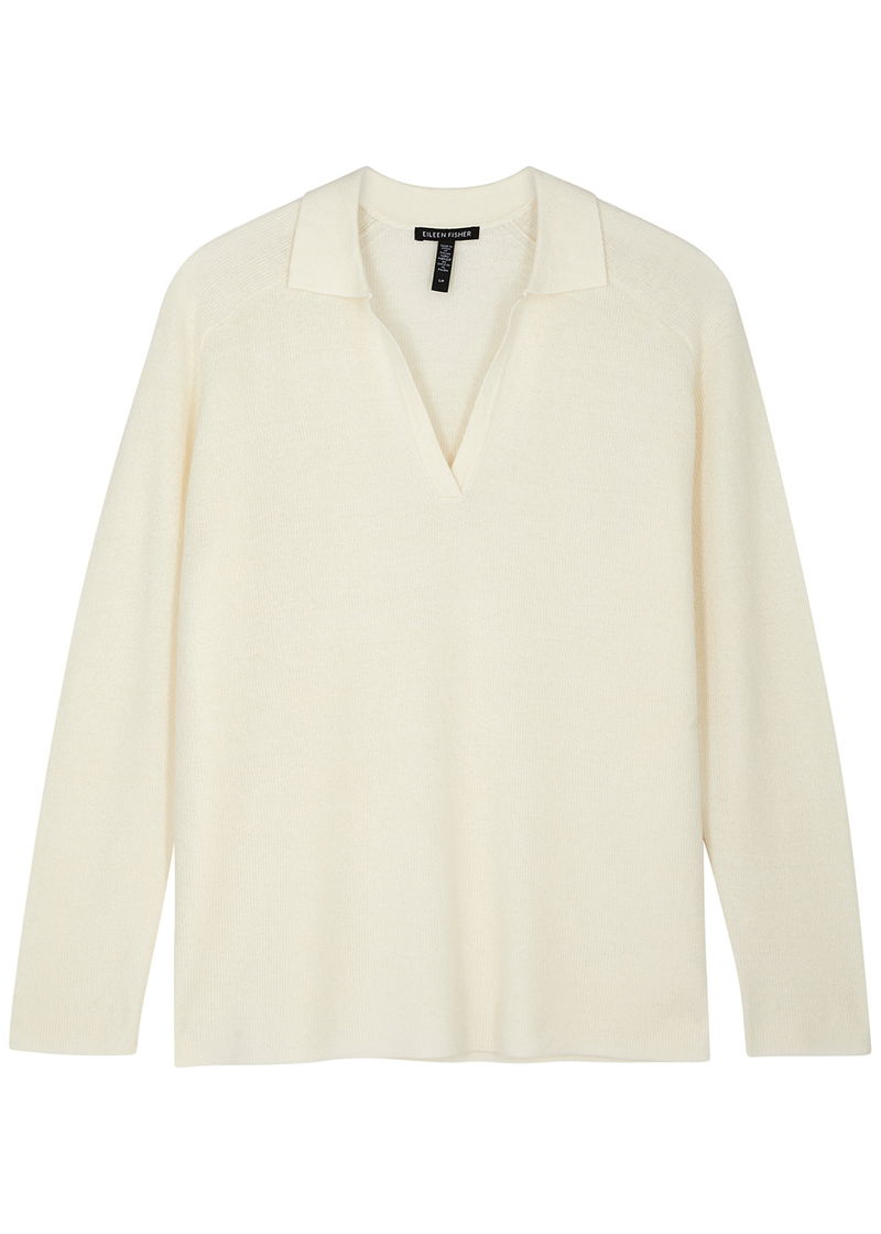 Eileen Fisher linen-blend jumper. Polo collar, dropped shoulders, ribbed. Slips on.