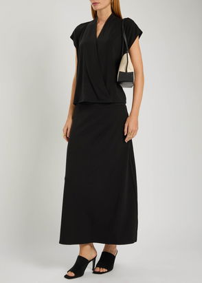 Eileen Fisher black stretch-jersey top. High-neck, dropped shoulders, side splits. Slips on.